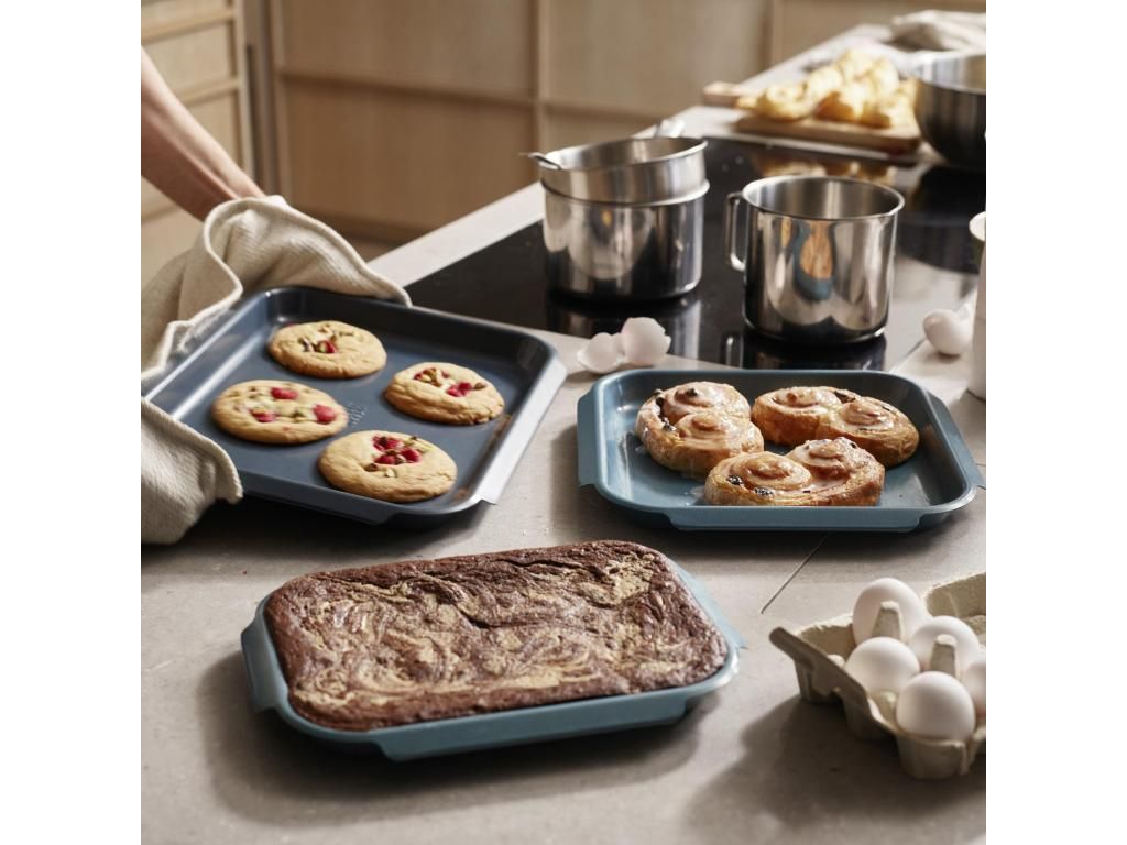 - The large NEST BAKE blue baking tray is ideal for preparing larger portions of cookies, roasted vegetables, meat, and homemade bread