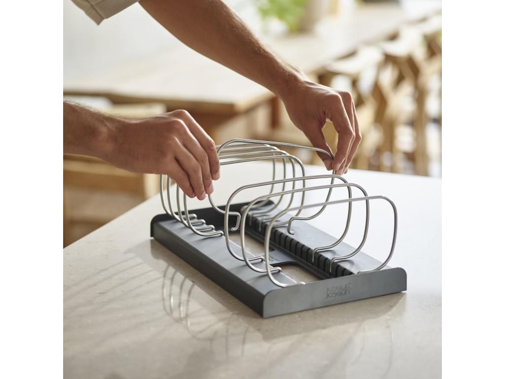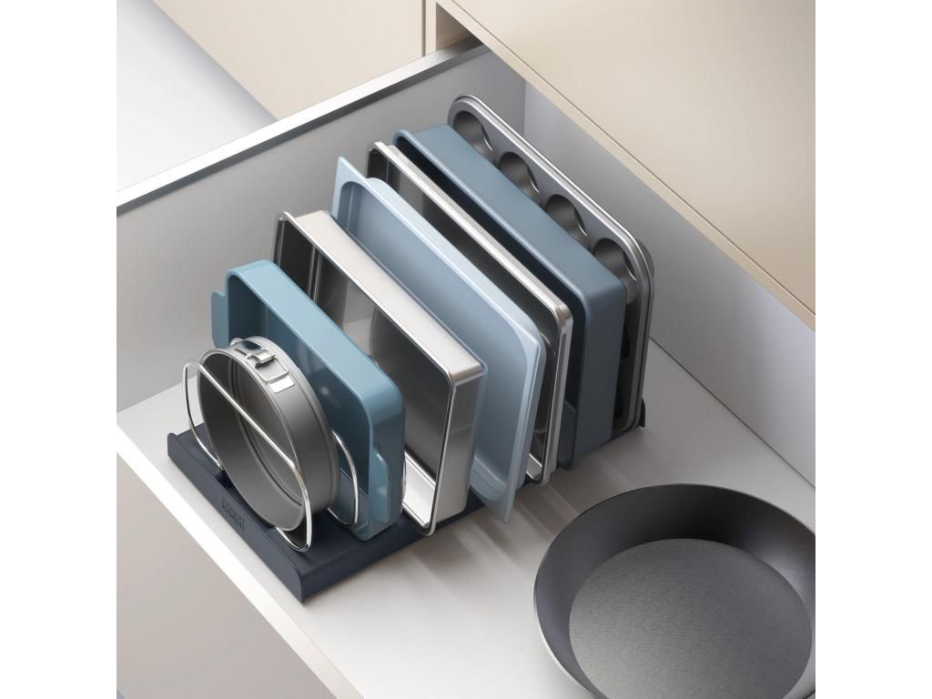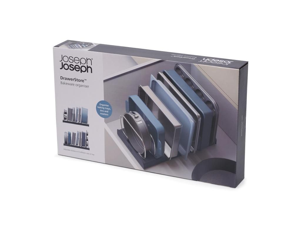 - The Joseph Joseph DRAWERSTORE baking sheet organiser helps to neatly arrange baking sheets, roasting pans, and cake tins in your kitchen drawer.