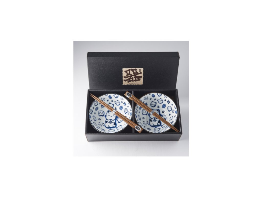 Theset includes 2 pairs of wooden chopsticks and 2 bowls with a pattern of blue Japanese cats on a white background. The rim of the bowls is bordered in silver. This set comes in an elegant black gift box, and is therefore suitable as a gift for friends or business associates.