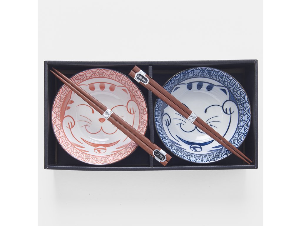 Dining bowl with chopsticks MANEKEI WAVE, set of 2 pcs, 400 ml, red and blue, MIJ