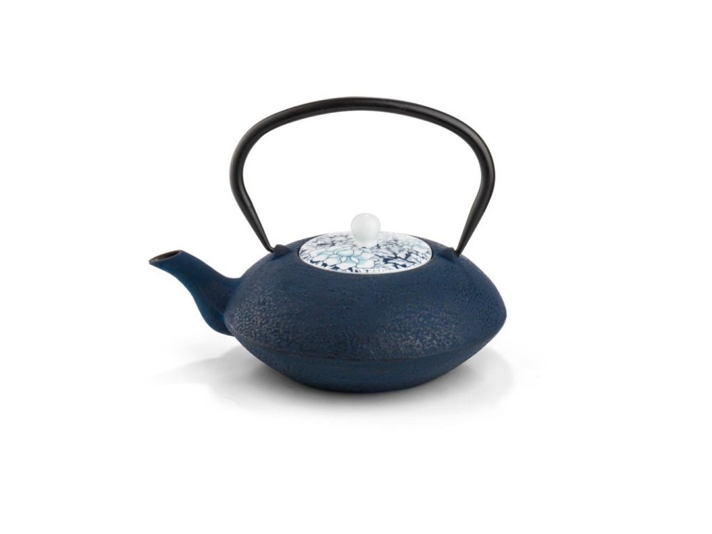 The Yantai teapot has a porcelain lid with a floral motive. The dark blue teapot is made of high quality cast iron and has an enamelled interior. Stainless steel tea filter included.