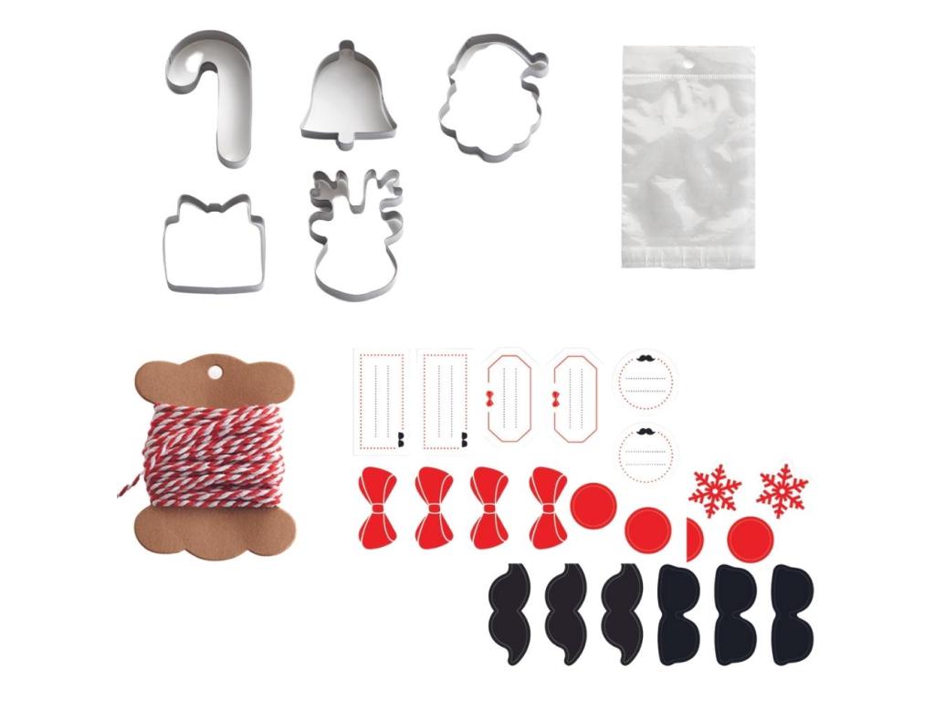 - 5 cookie cutters with different Christmas shapes (Santa Claus, reindeer, gift, candy cane, bell)
