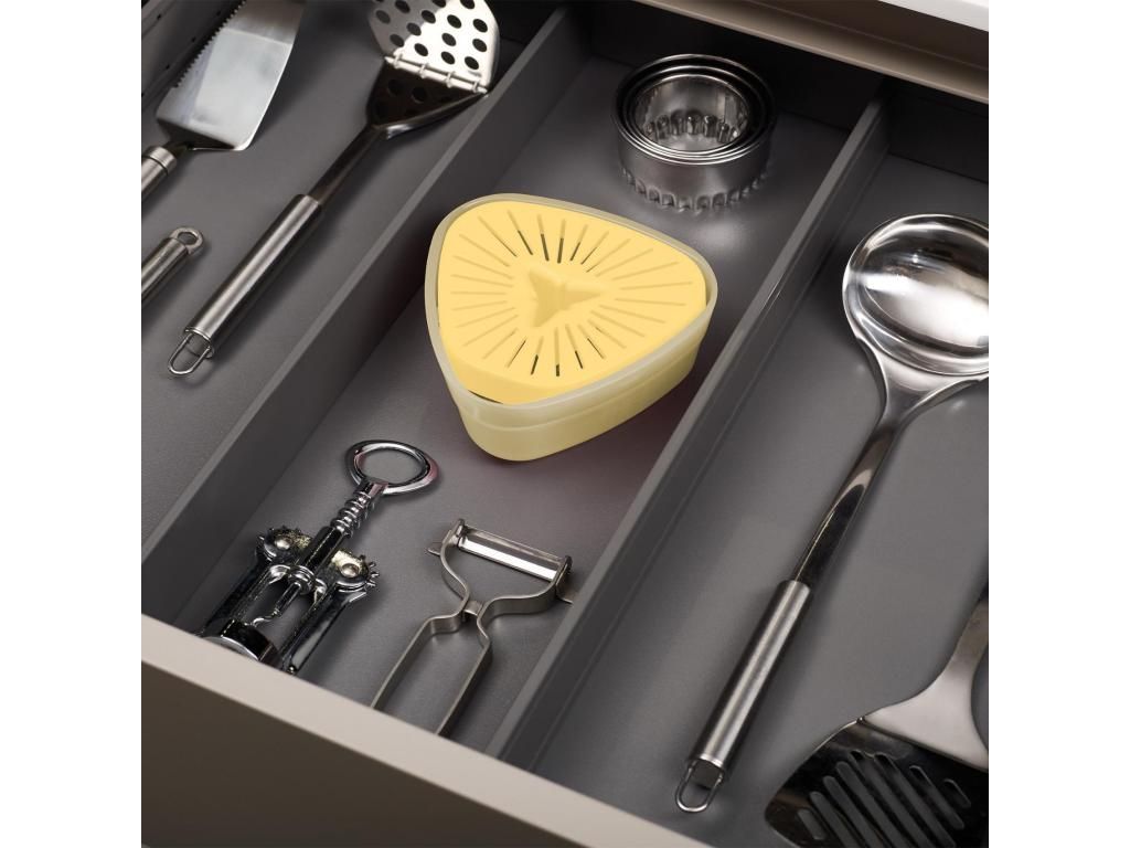 - Its compact design saves space in the kitchen and, thanks to its thoughtful shape, fits comfortably in a drawer among other kitchen utensils.