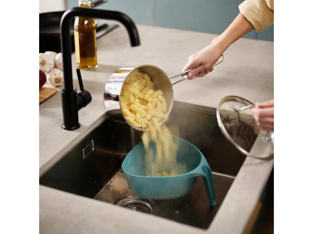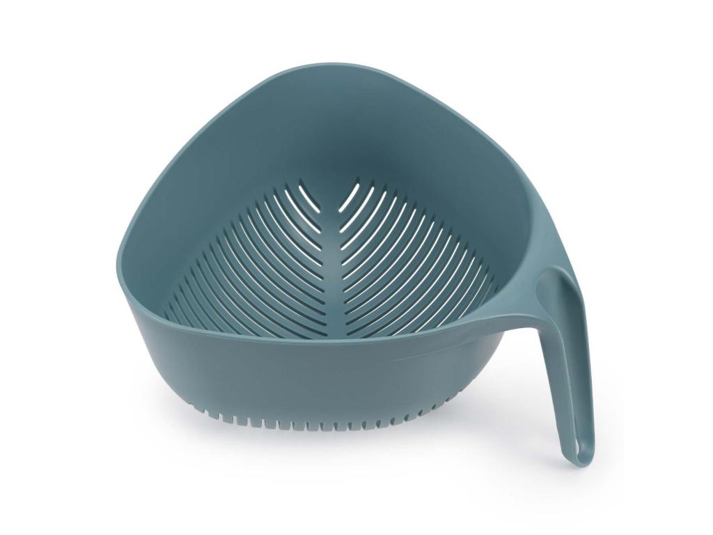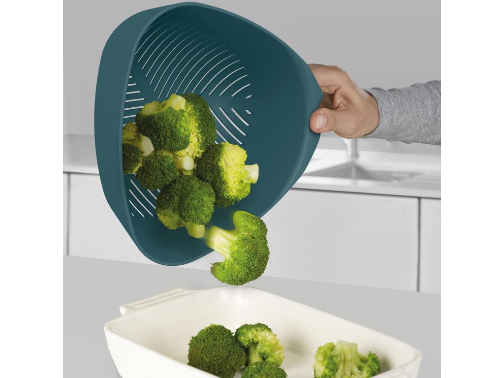 - Colander Joseph Joseph DUO makes it easier to strain pasta, vegetables and fruit thanks to its well-thought-out shape and ergonomic vertical handle.