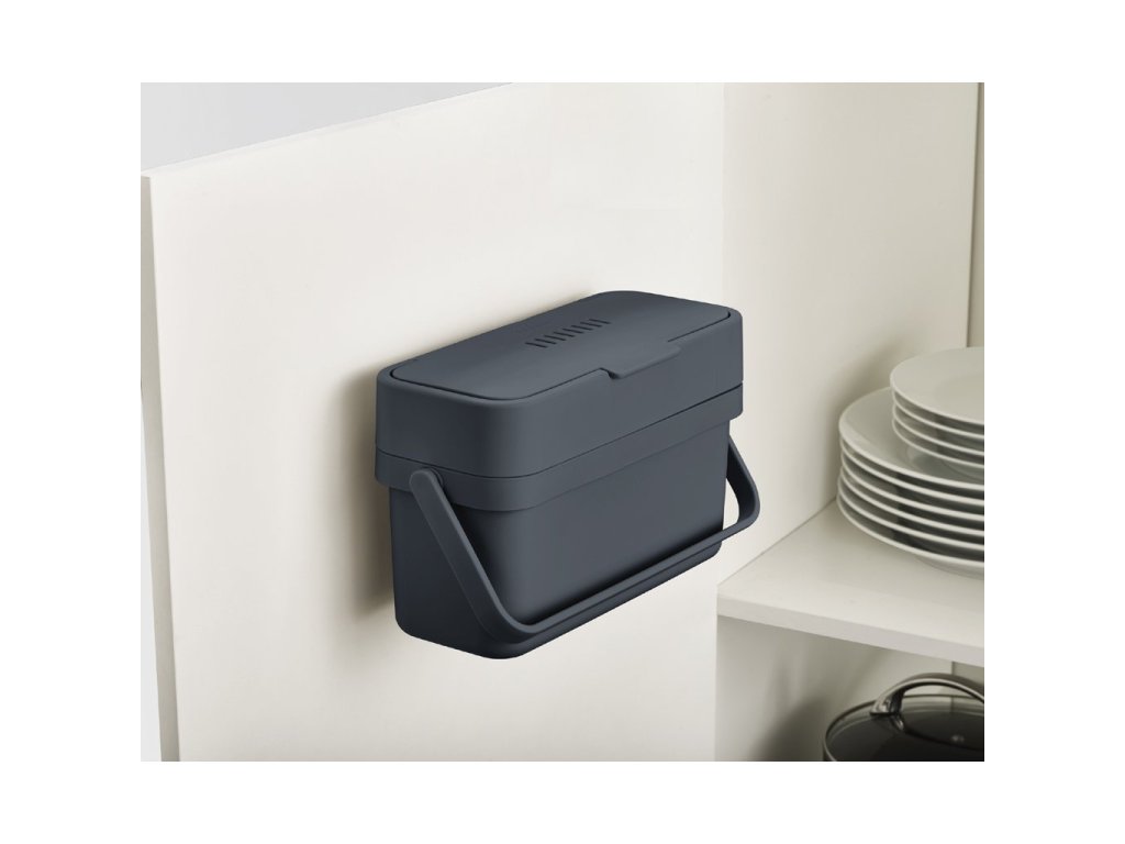 The JOSEPH JOSEPH Compo container has been designed as a practical basket for leftovers. Thanks to its narrow shape, it does not take up space on the worktop. It comes with brackets for installation on the inside of the door. The lid of the container can be opened wide so that leftovers can be easily scooped from the plates directly into the container. The lid has lockable ventilation holes. In the open position, they allow moisture to escape and thus reduce possible odours. In summer, the air vent cap prevents insects from entering the container. The capacity of the container is 4 litres. In the case of composting, it is advisable to use biodegradable bags.