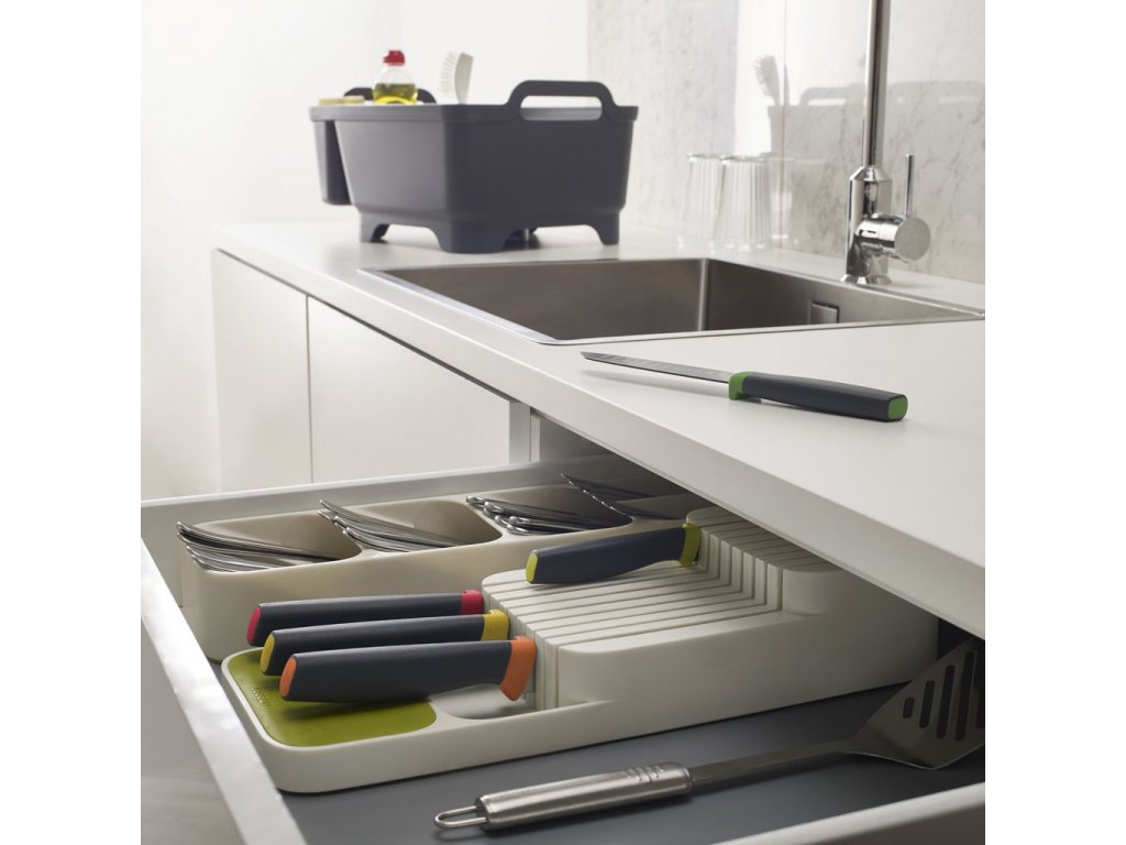 Storing cutlery at an angle above each other in the JOSEPH JOSEPH DrawerStore saves more than half the drawer space. You can insert cutlery into the marked slots on both sides. Non-slip feet ensure the stability of the compartments in the drawer. The organiser can be used in a drawer with a minimum depth of 8 cm.