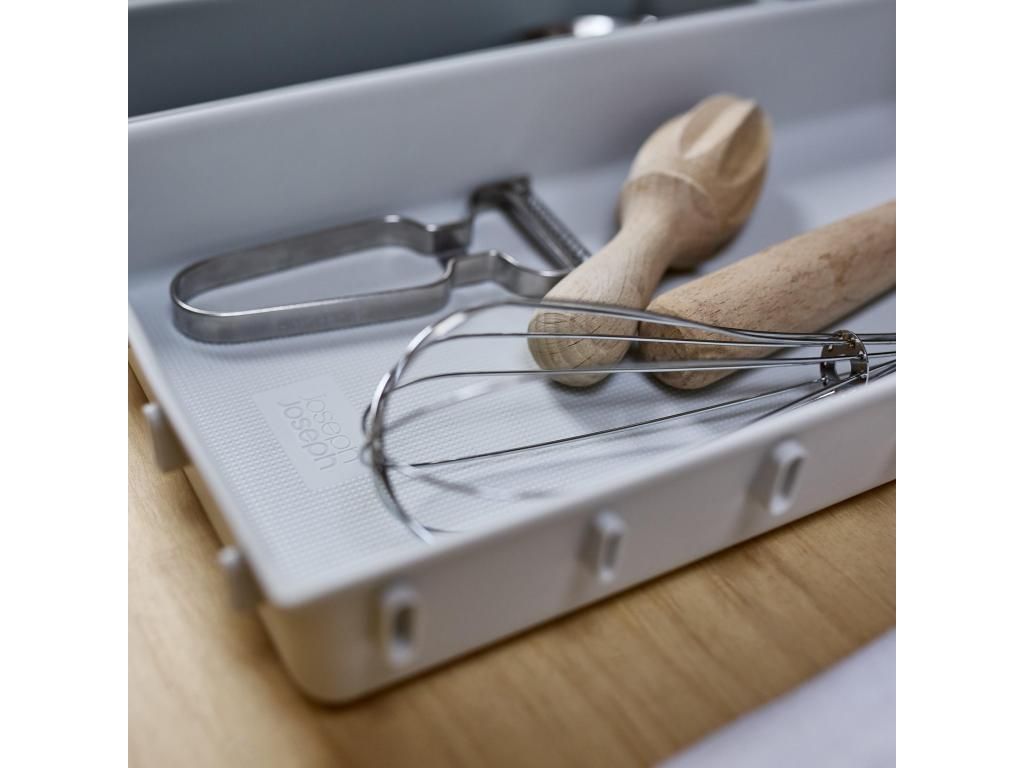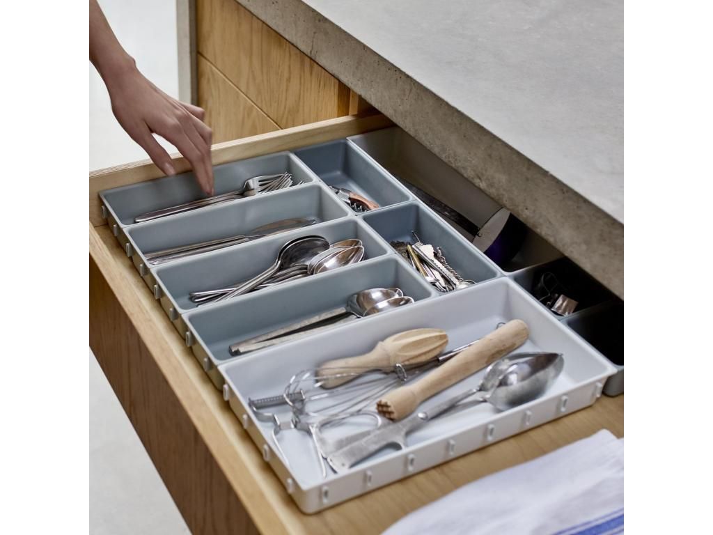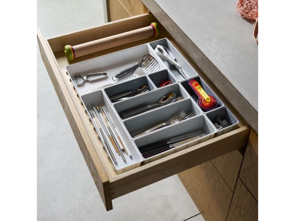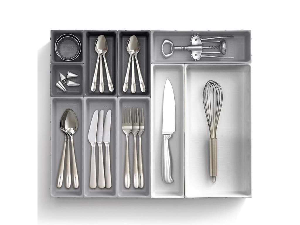 - The Joseph Joseph BLOX drawer organizer offers a practical modular system that helps to neatly arrange cutlery, kitchen utensils, office supplies, or small tools.