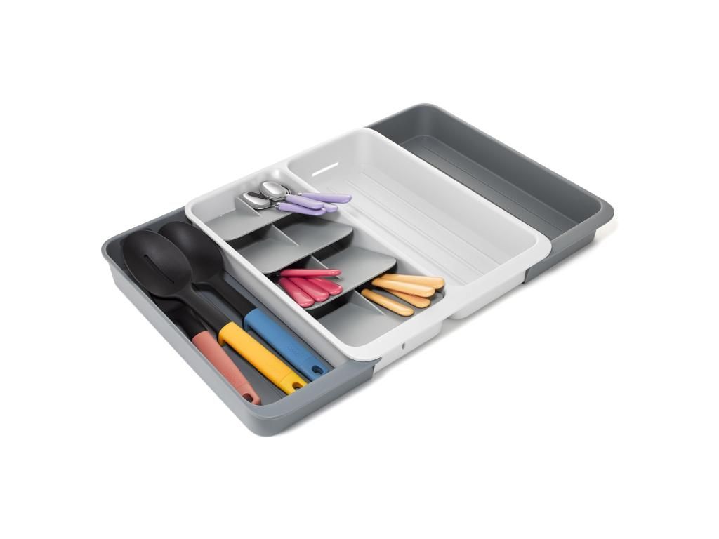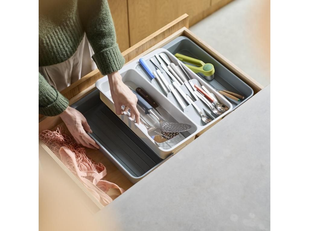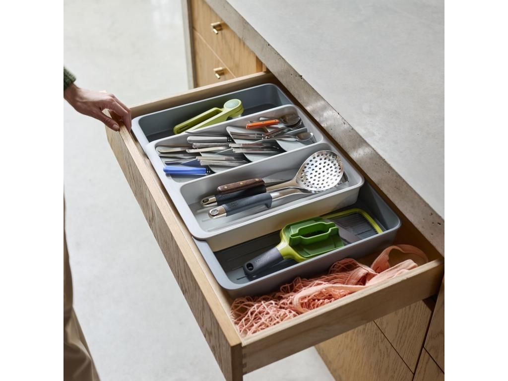 - The Joseph Joseph DRAWERSTORE drawer organizer helps to neatly arrange cutlery and kitchen utensils in your kitchen cabinet drawer.