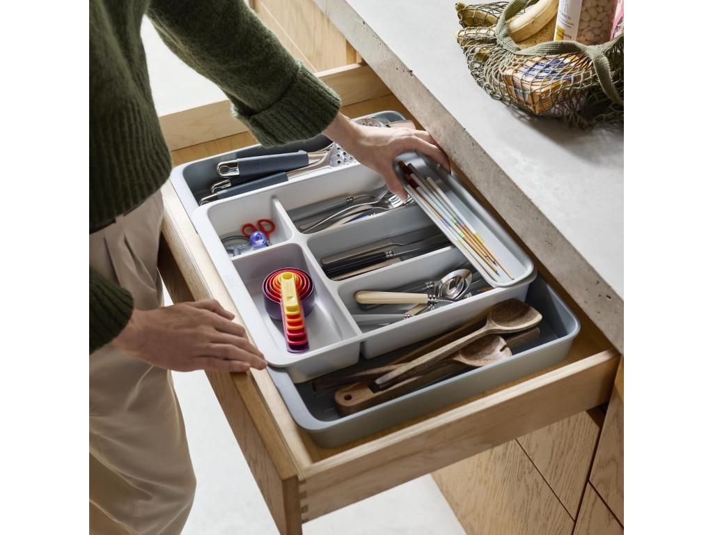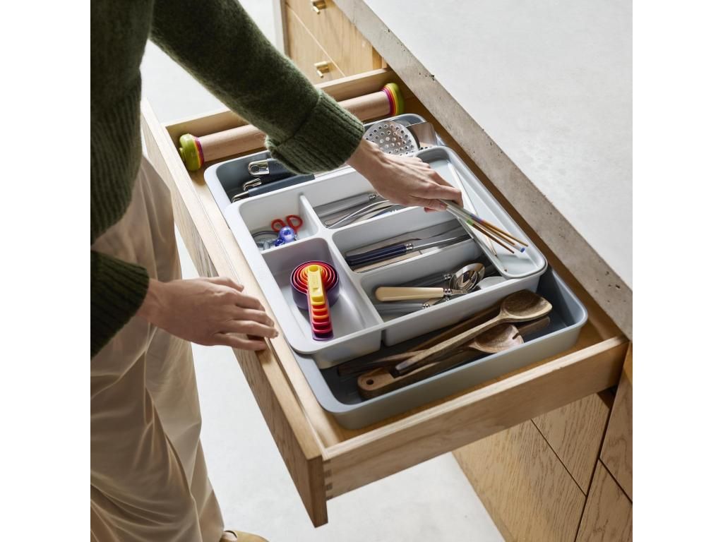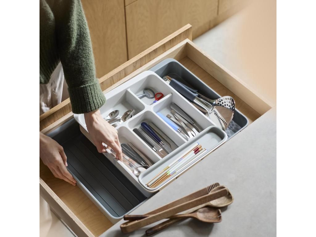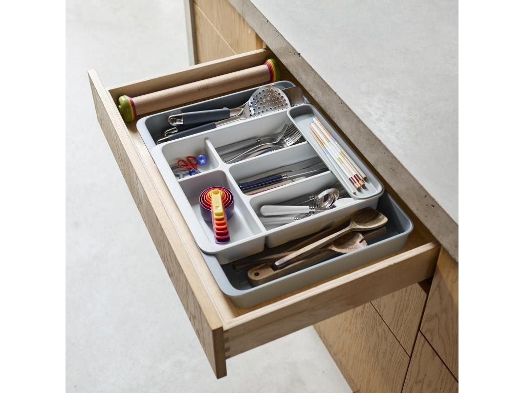 - The Joseph Joseph DRAWERSTORE drawer organizer helps to clearly arrange cutlery, kitchen utensils, and small tools in a kitchen cabinet drawer.