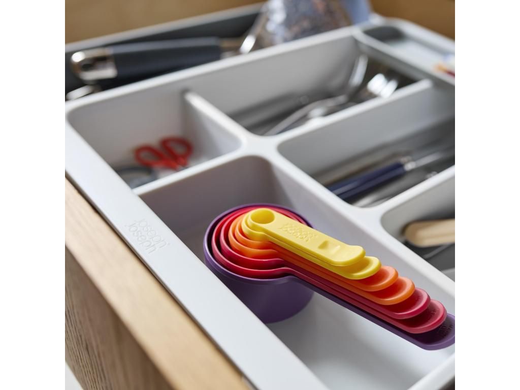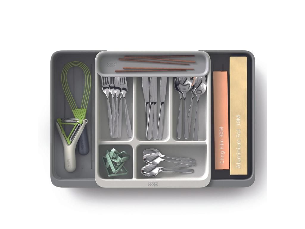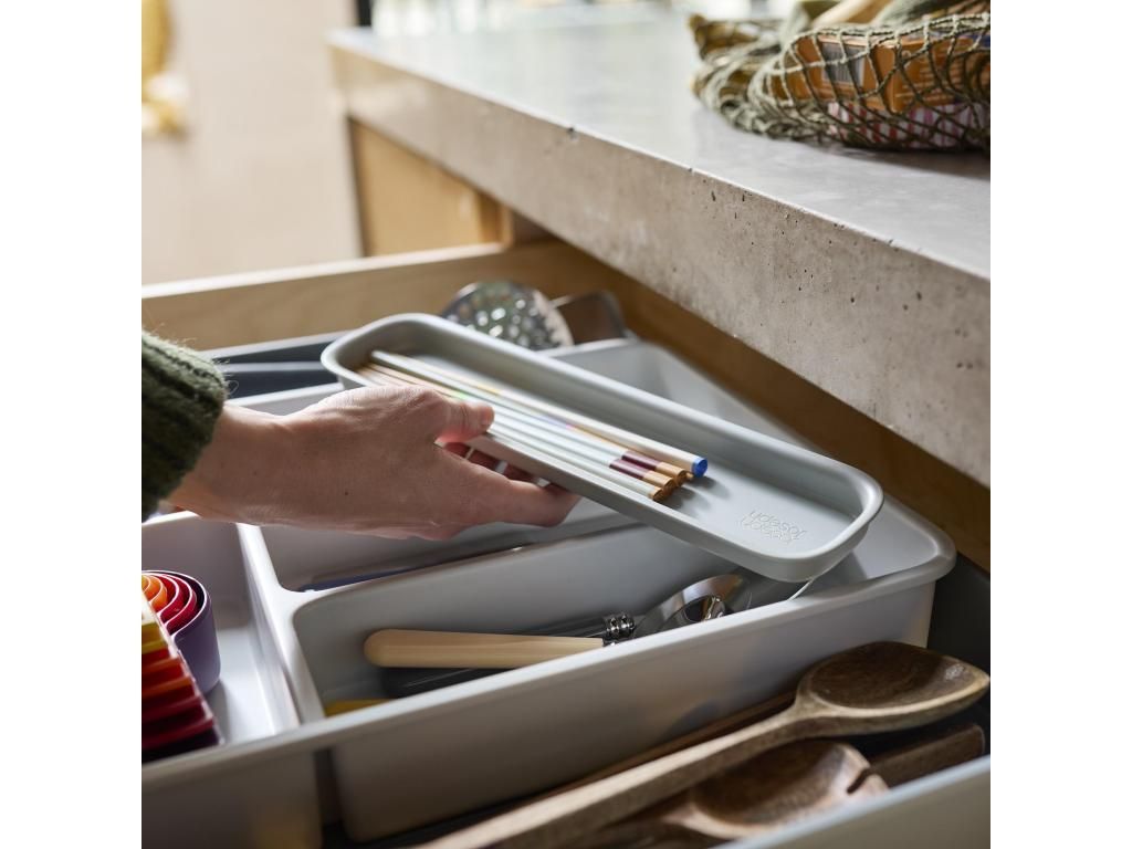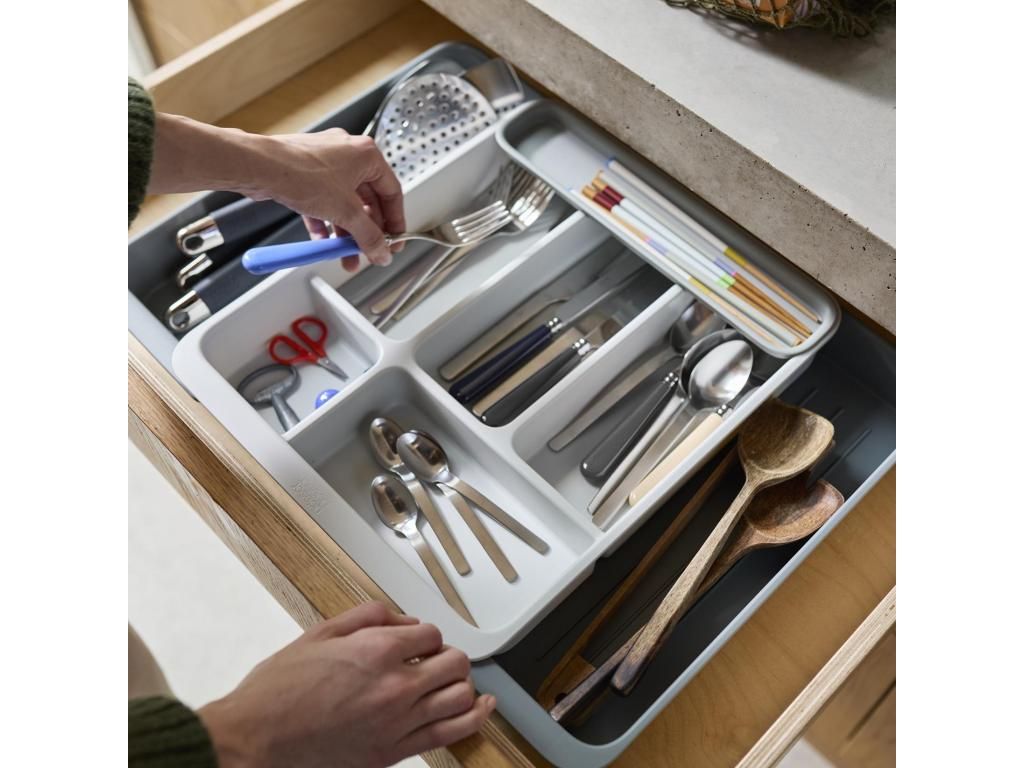 - The Joseph Joseph DRAWERSTORE drawer organizer helps to clearly arrange cutlery, kitchen utensils, and small tools in a kitchen cabinet drawer.