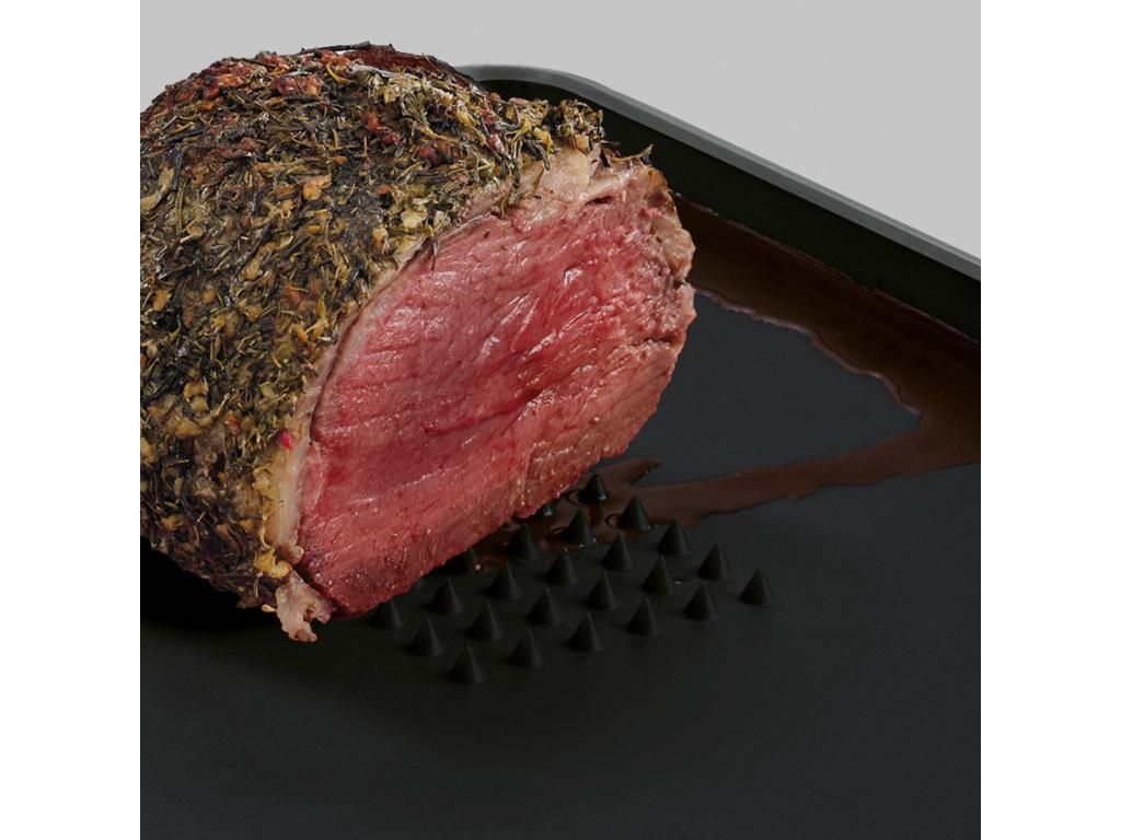 - The specially shaped slope directs juice from meat or fruit to the drainage edge, where it can be easily and controllably poured off.