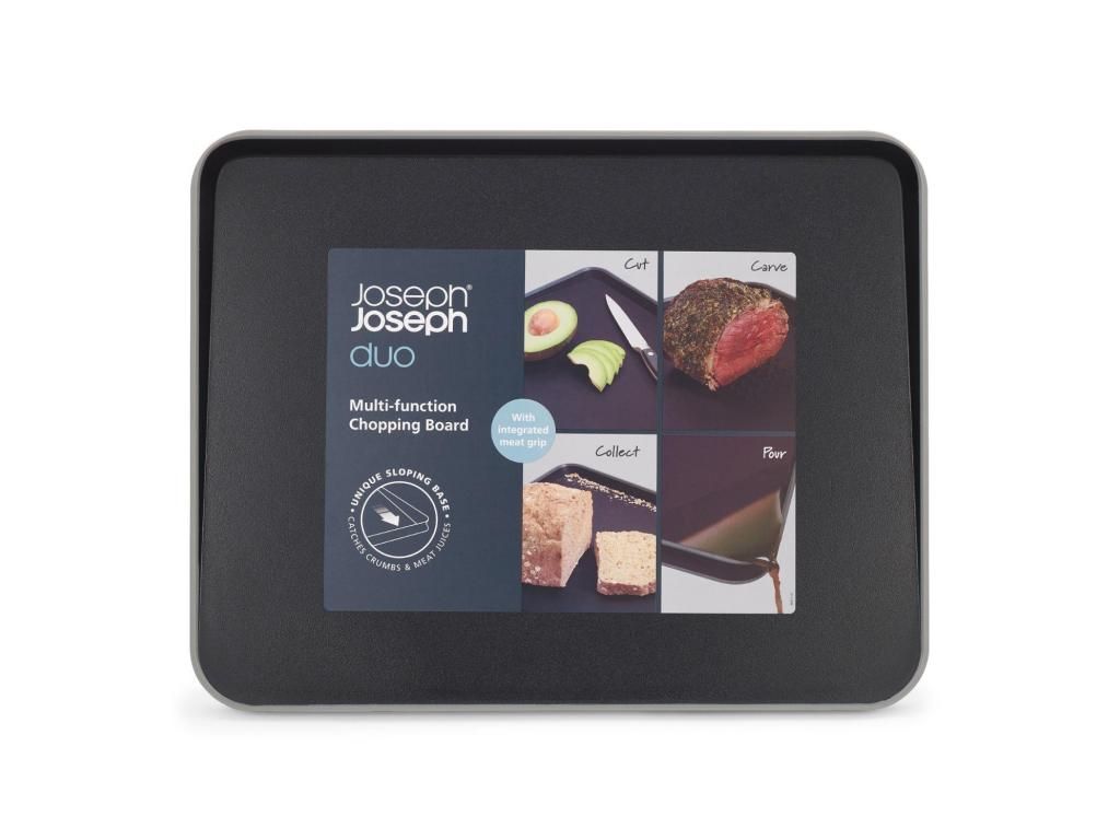 - The double-sided multifunctional Joseph Joseph DUO CUT&CARVE chopping board offers a sophisticated design with a sloped surface for efficient liquid drainage during cutting.