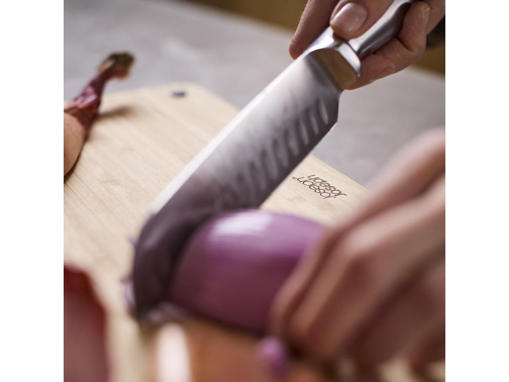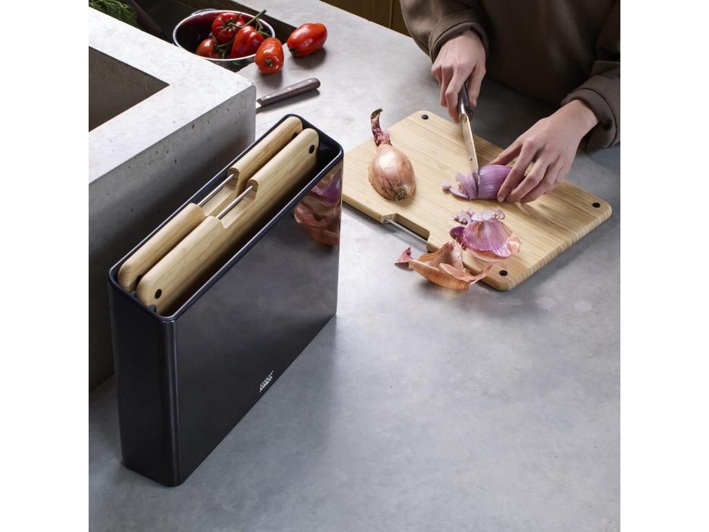 - The Joseph Joseph FOLIO set of 3 bamboo cutting boards offers a practical solution for food preparation and neat storage in a modern stand that keeps your countertop organized.
