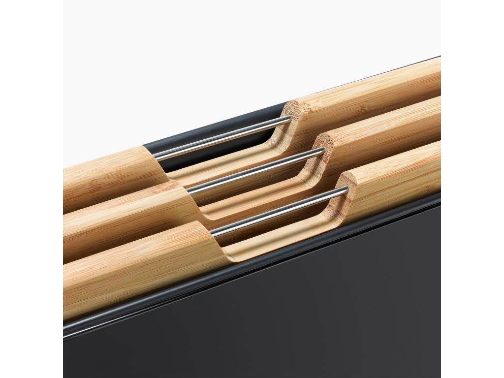 - Integrated metal bars on the top of the cutting boards make them easy to grip and allow for quick removal of the correct board from the stand during cooking.