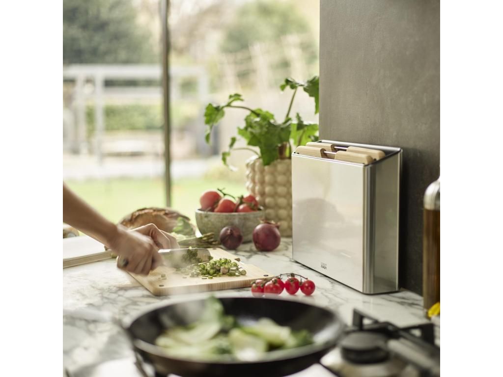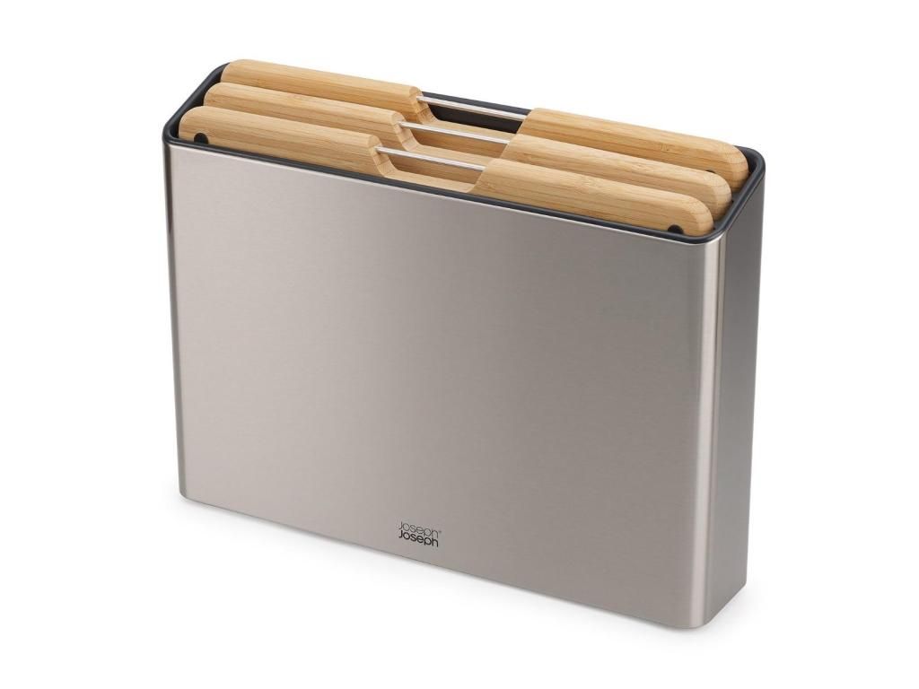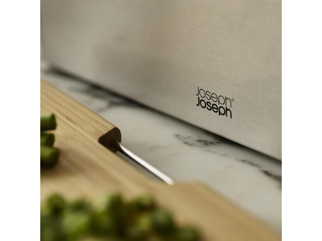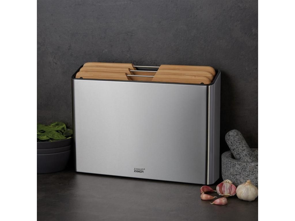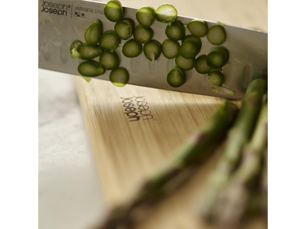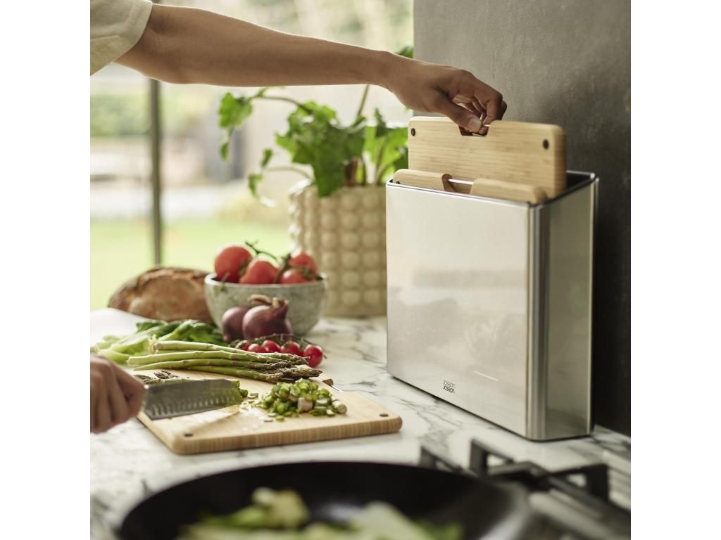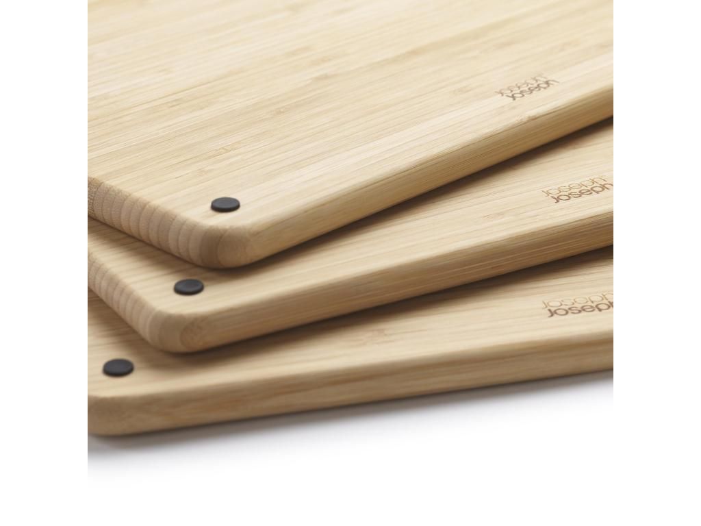 - The Joseph Joseph FOLIO set of 3 bamboo cutting boards offers a practical solution for preparing various ingredients while keeping your countertop neatly organized thanks to its elegant stand.