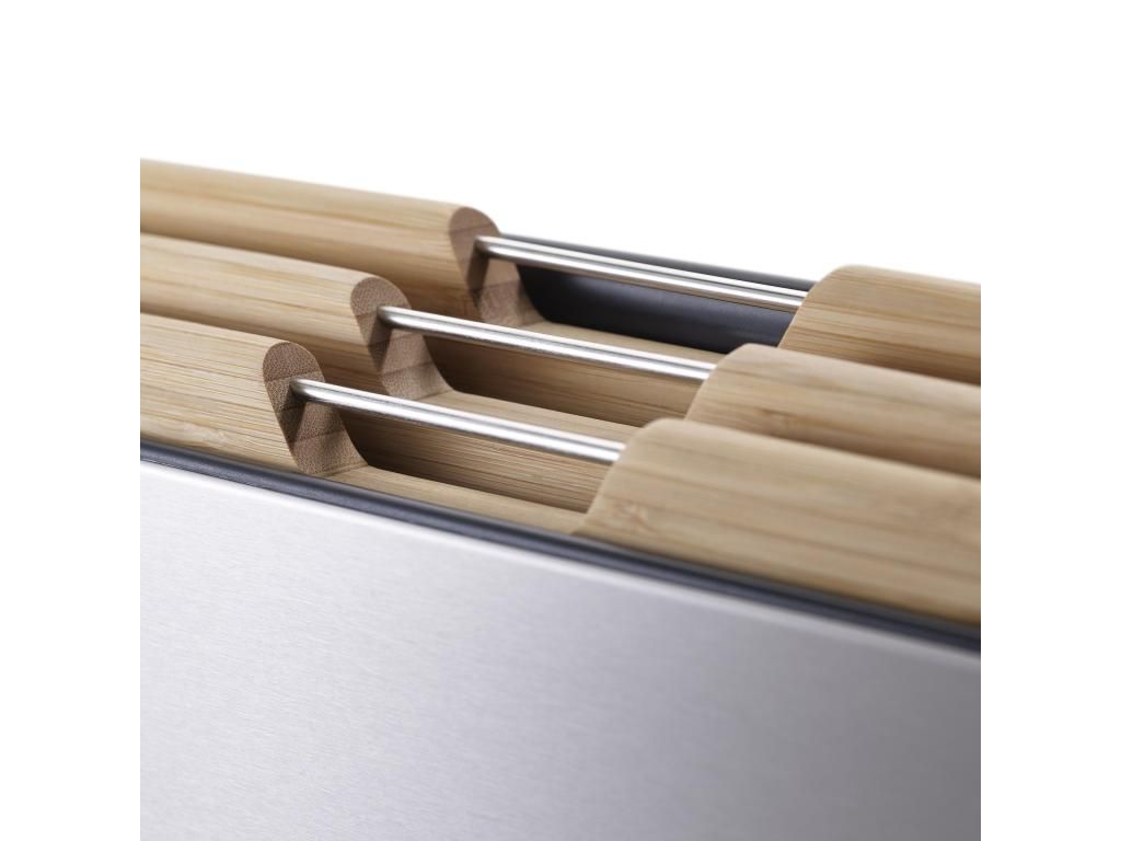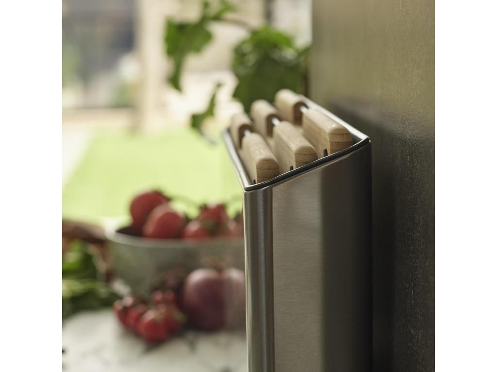 - Integrated stainless steel rods on the top of the cutting boards make them easy to grip and allow for quick removal of the correct board from the stand.