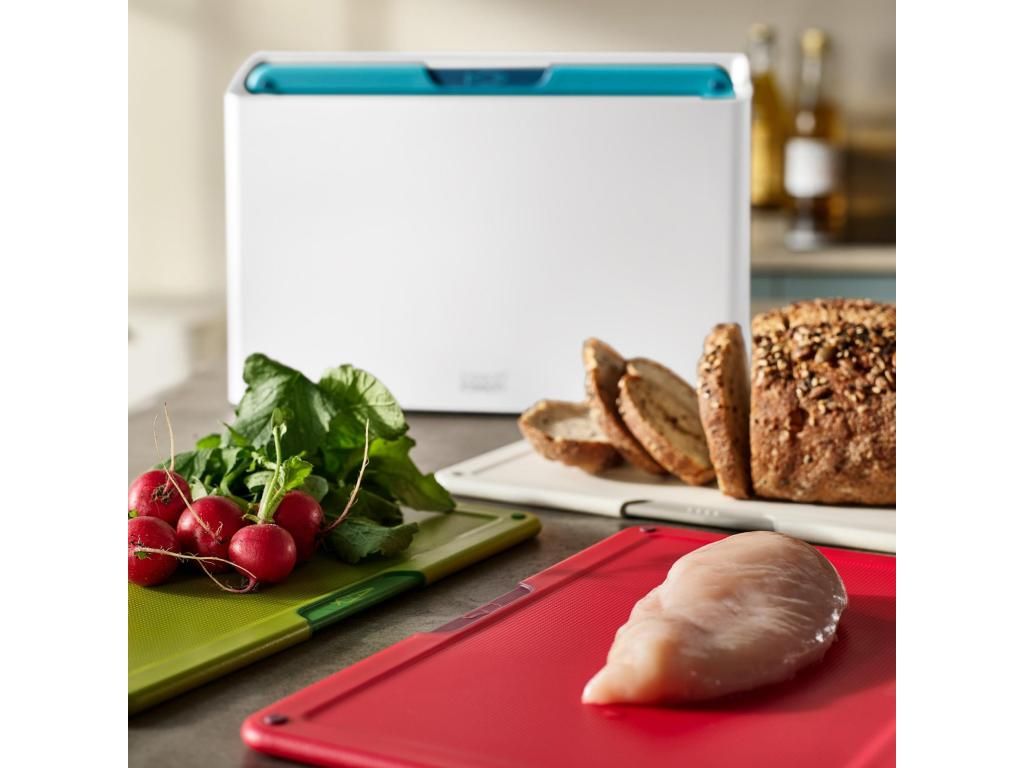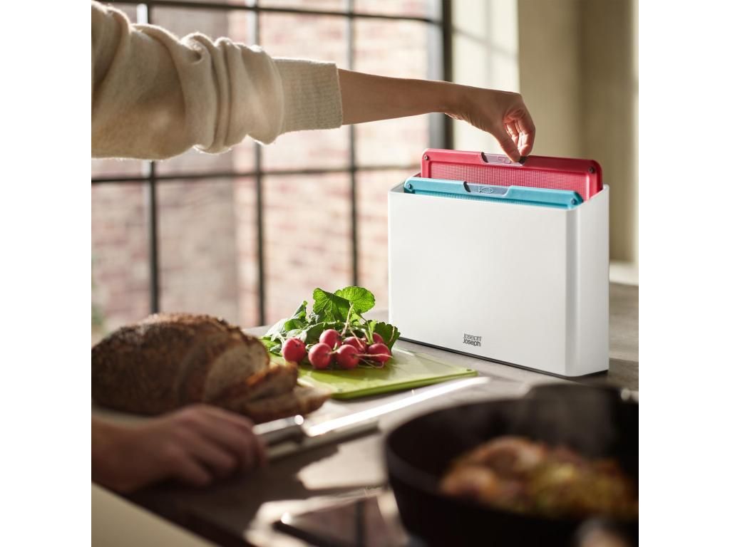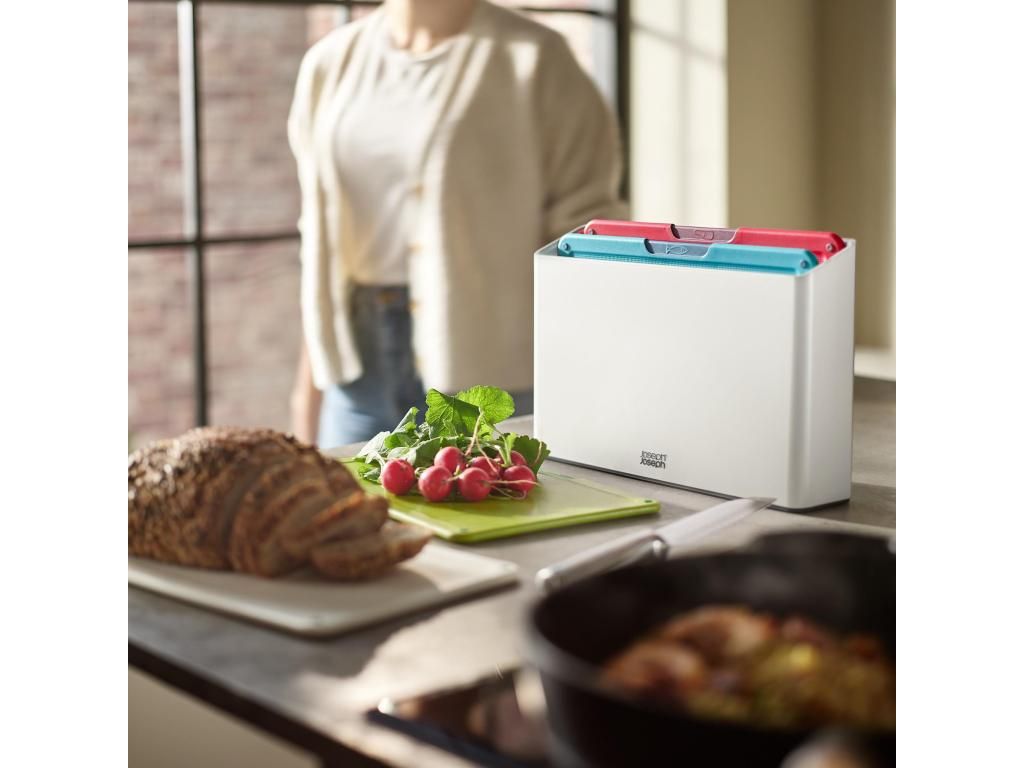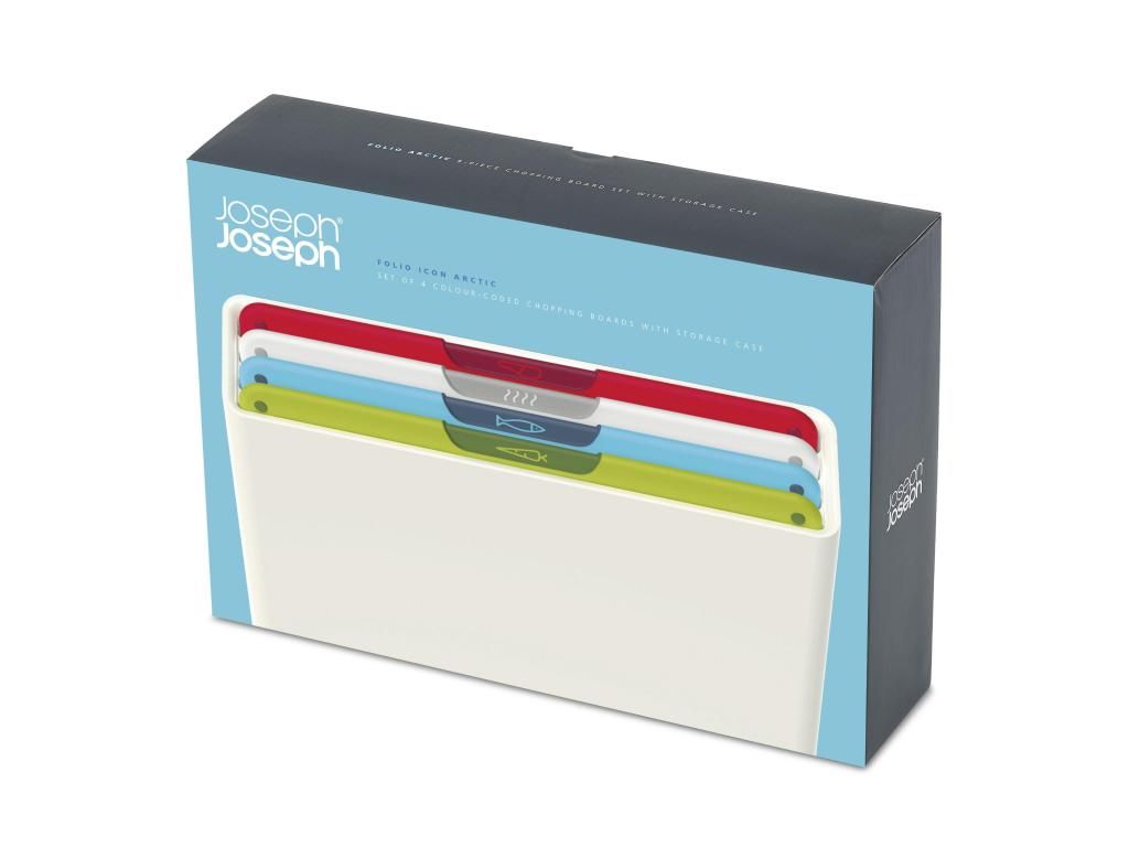 - Joseph Joseph FOLIO ICON chopping board set includes 4 practical boards stored in a compact stand, helping to keep your countertop tidy during everyday food preparation.