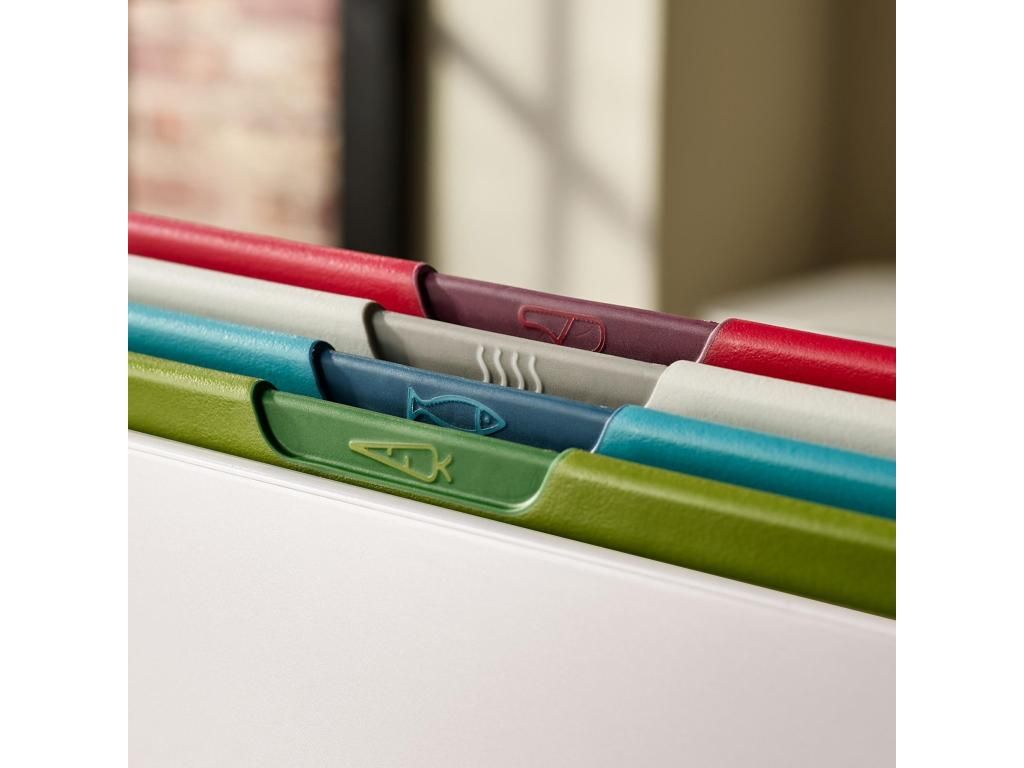 - Each board is colour-coded and features an icon representing the type of food, so you can easily select the right board for specific ingredients when cooking.