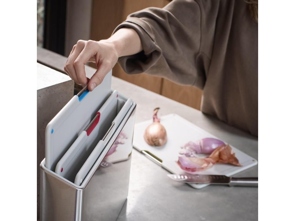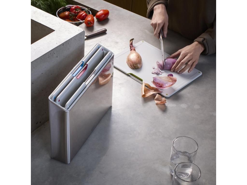 - The Joseph Joseph FOLIO STEEL chopping board set includes 4 practical boards stored in an elegant stainless steel stand, which helps to keep the worktop neatly organized during food preparation.