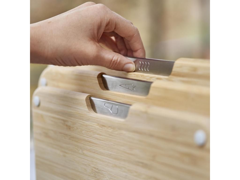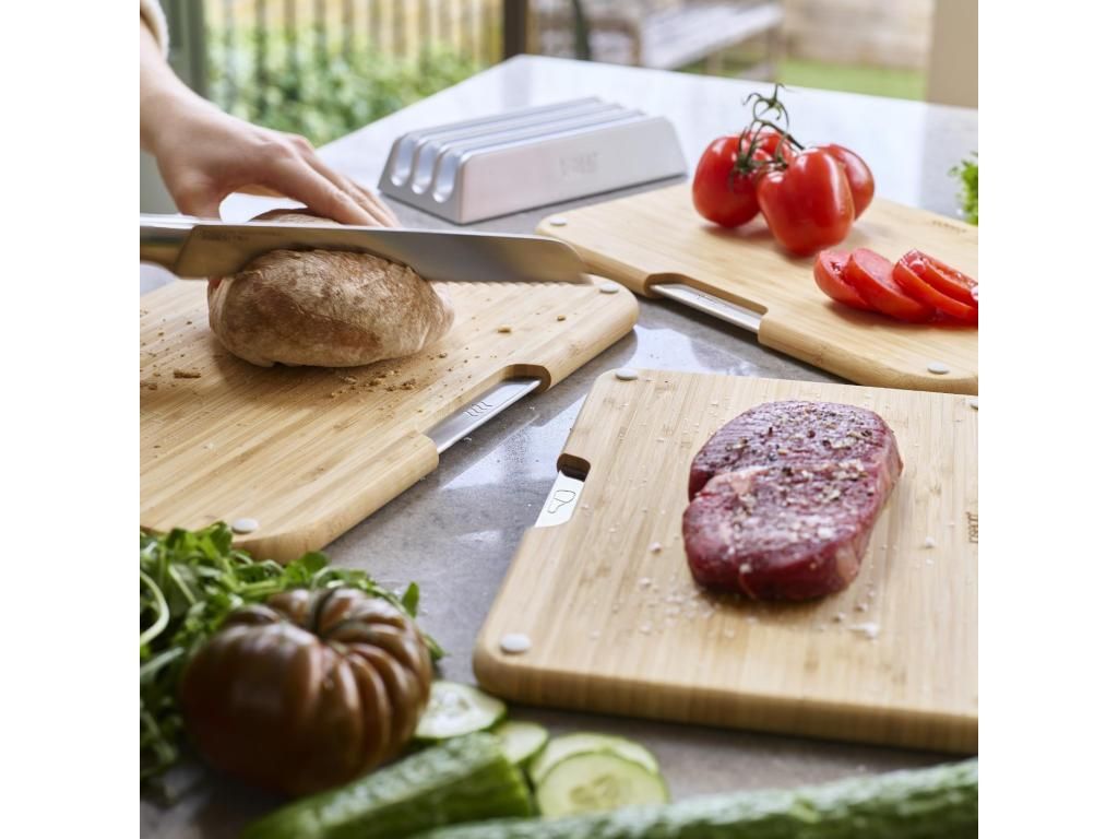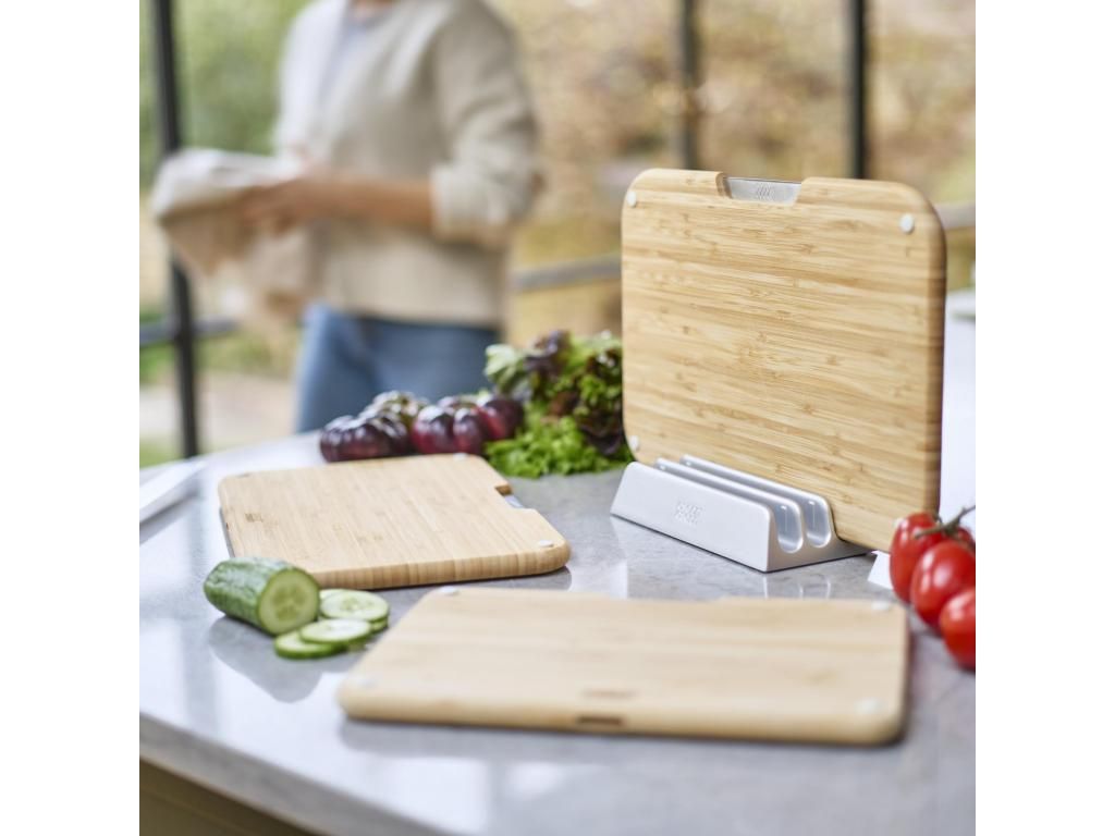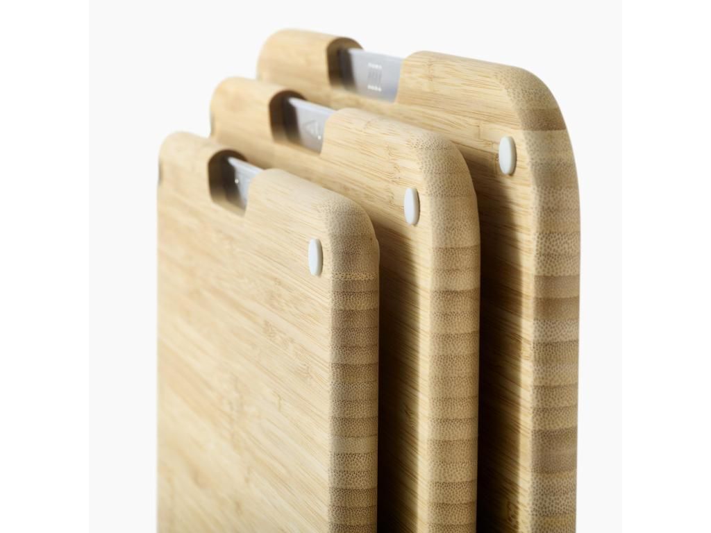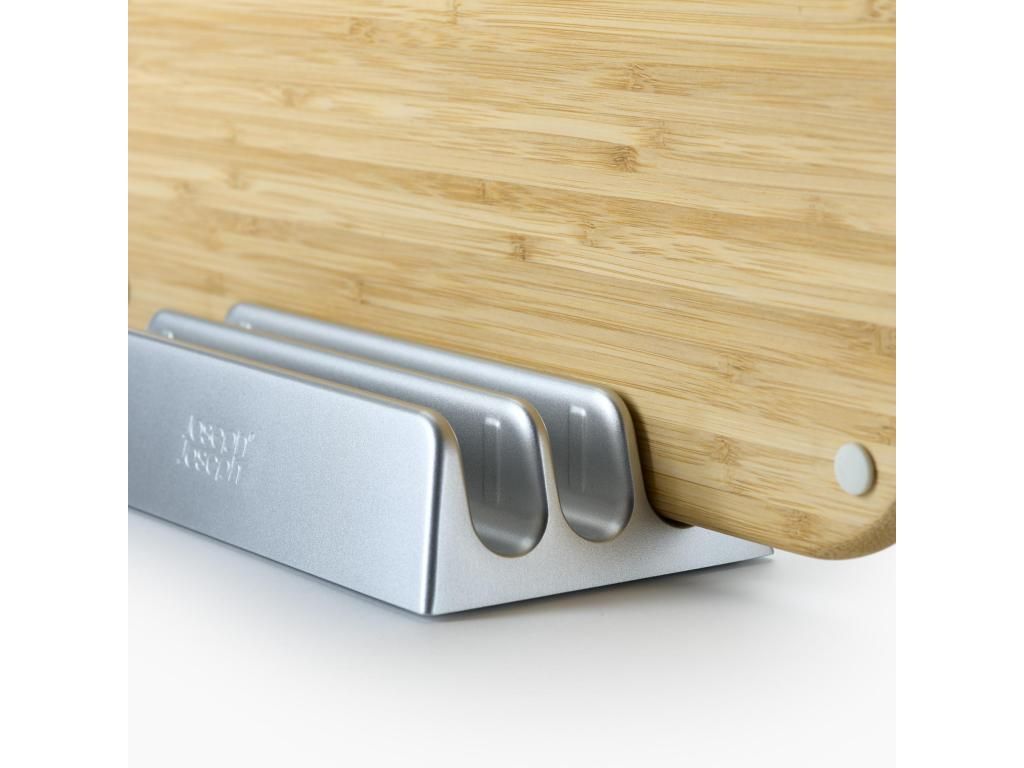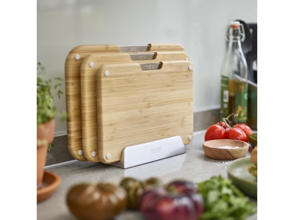 - The Joseph Joseph NEST chopping board set includes 3 bamboo boards stored in a compact metal rack that keeps your countertop neatly organised during food preparation.