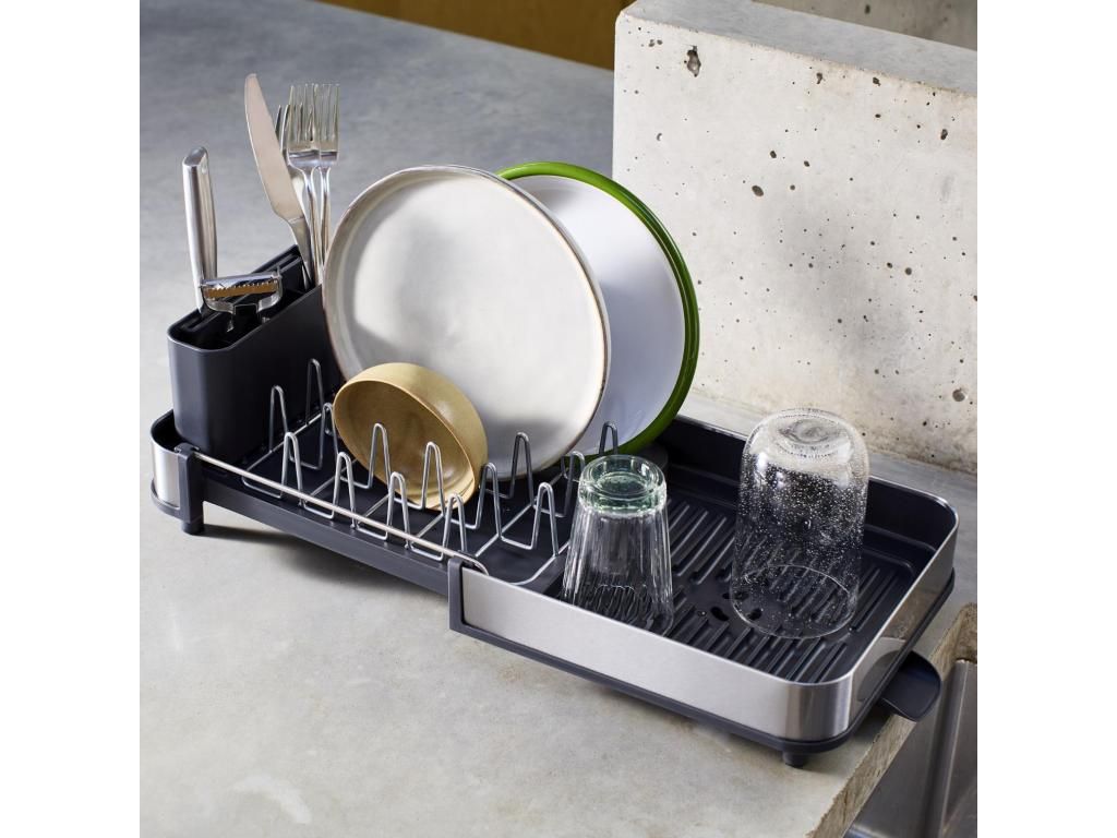 - The Joseph Joseph EXTEND SLIM dish drying tray is designed for smaller kitchens where every inch of counter space needs to be utilized while still providing ample room for drying dishes.