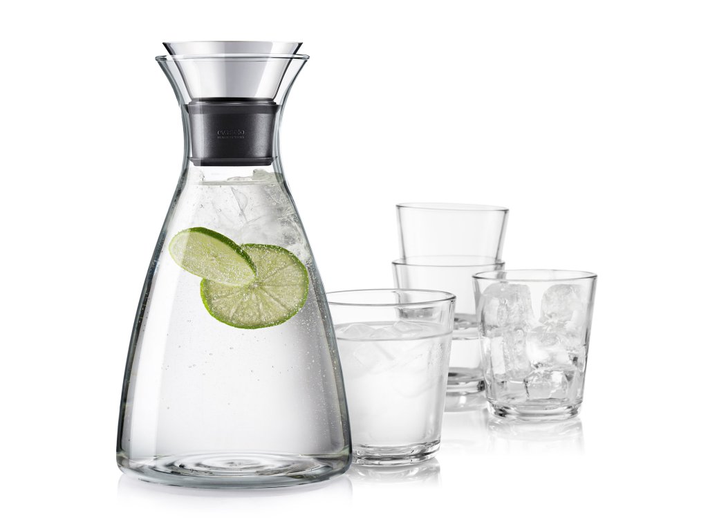 The Eva Solo product range is characterised by the simple and practical design of its products. One of them is the Eva Solo Carafe, which belongs to the family of dripless vessels. The functional and elegant Eva Solo carafe with patented stainless steel and silicone pouring lip is suitable for storing and serving hot and cold drinks. We now offer it in a set of four glasses made of high-quality heat-resistant glass, each with a volume of 0.25 l.
