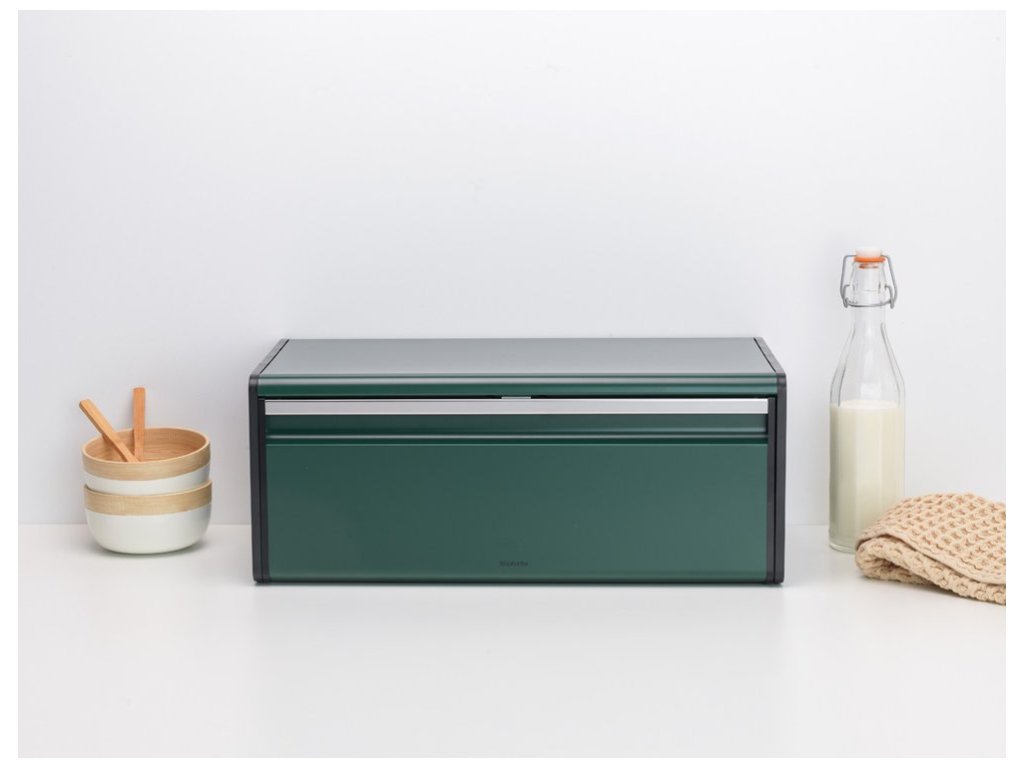 Looking for a space-saving solution to keep your bread fresh or crispy? Meet the Fall Front Breadbox from Brabantia. Fits up to two loaves, but doesn't need much spacethanks to its rectangular design . The Fall Front Bread Bin has a flat top, allowing for additional bins. Plus, it keeps your bread fresh thanks to the magnetic closure. And if you don't have any space on your kitchen counter, you'll appreciate the option of simply hanging it on the wall using the hanging loops on the back of the bread machine.