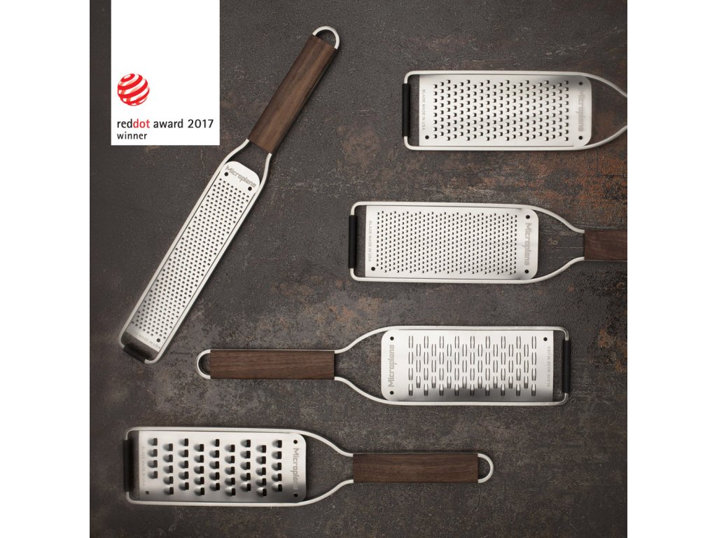 The new Master Collection , awarded the prestigious Red Dot Design Award 2017, includes several types of elegant kitchen graters with beautiful handles made of oiled American walnut wood. Timelessly designed with a practical non-slip rubber tip, the graters are based on the Gourmet series and were designed in collaboration with professionals and passionate hobby cooks. The long, slender, slightly curved functional part, which has an extra wide reach and perfect sharpness, is made of 18/8 surgical stainless steel. The Master range combines the unforgettable Microplane® heritage of the similarity of planers to woodworking tools with the contemporary design of artfully crafted artisan products of impeccable quality, functionality and durability.