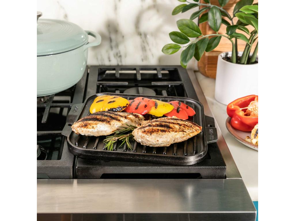 - The other side has distinctive ribbing that is ideal for grilling steaks, burgers or fish, creating an attractive imprint and draining excess fat.
