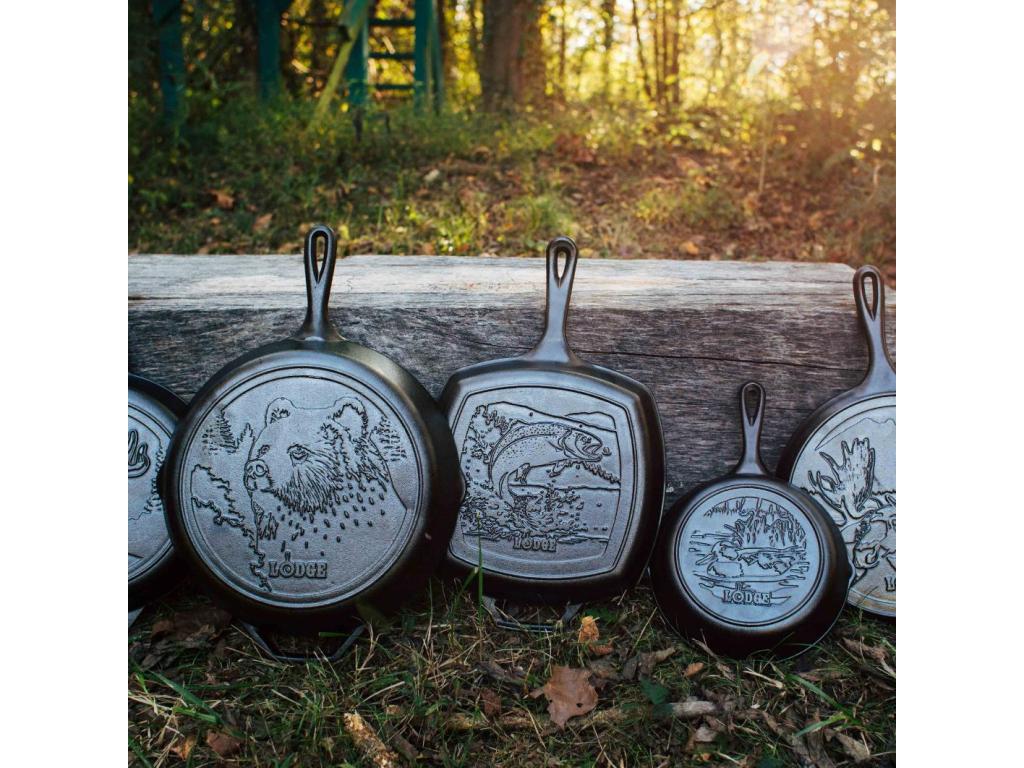 - The square cast iron grill pan Lodge FISH from the Wildlife series brings honest cooking with American tradition to the kitchen and nature.