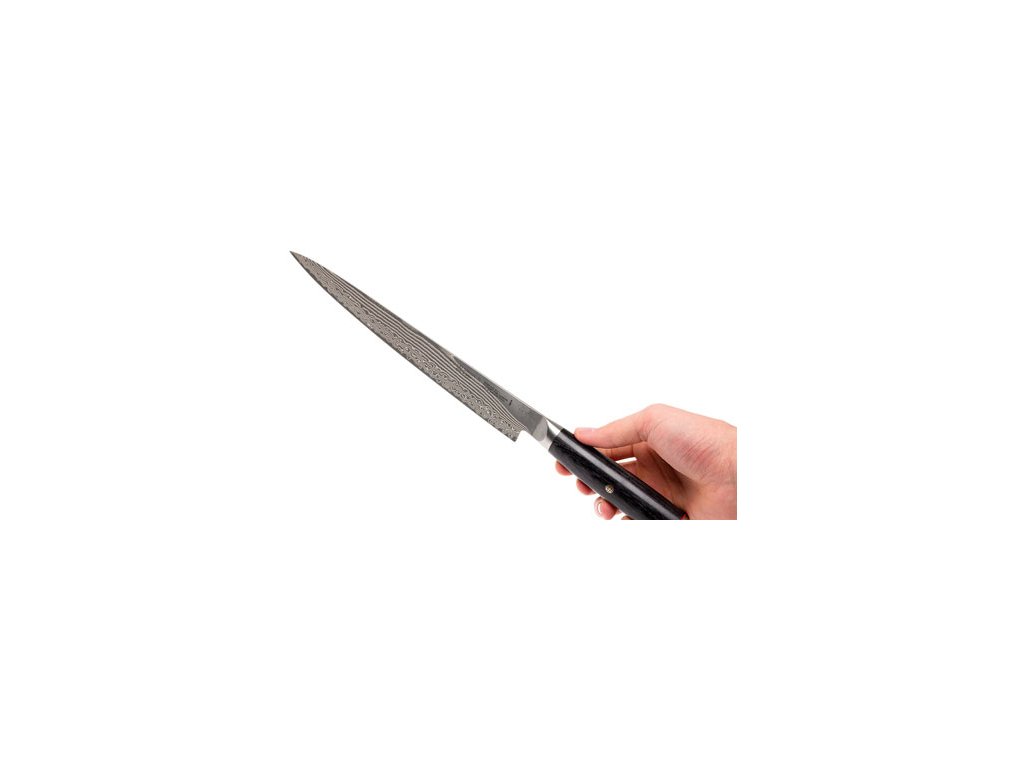Extremely sharp Japanese SUJIHIKI knife with slim long blade excels in slicing fine meat. The low blade height reduces friction and the knife penetrates meat more easily. If you have worked with European knives before, you will be surprised by the blade's extraordinary fineness. SUJIHIKI is the Japanese version of the Western filleting knife. Slice raw meat and fish into fine slices without much effort. You will also appreciate the unsurpassed geometry of the knife when carving roasts, hams or poultry breasts. If you are a beef carpaccio lover, this knife should become a must-have in your kitchen. The sturdy, well-balanced, ergonomic exotic wood handle fits perfectly in the hand and minimises hand strain when working at different angles.