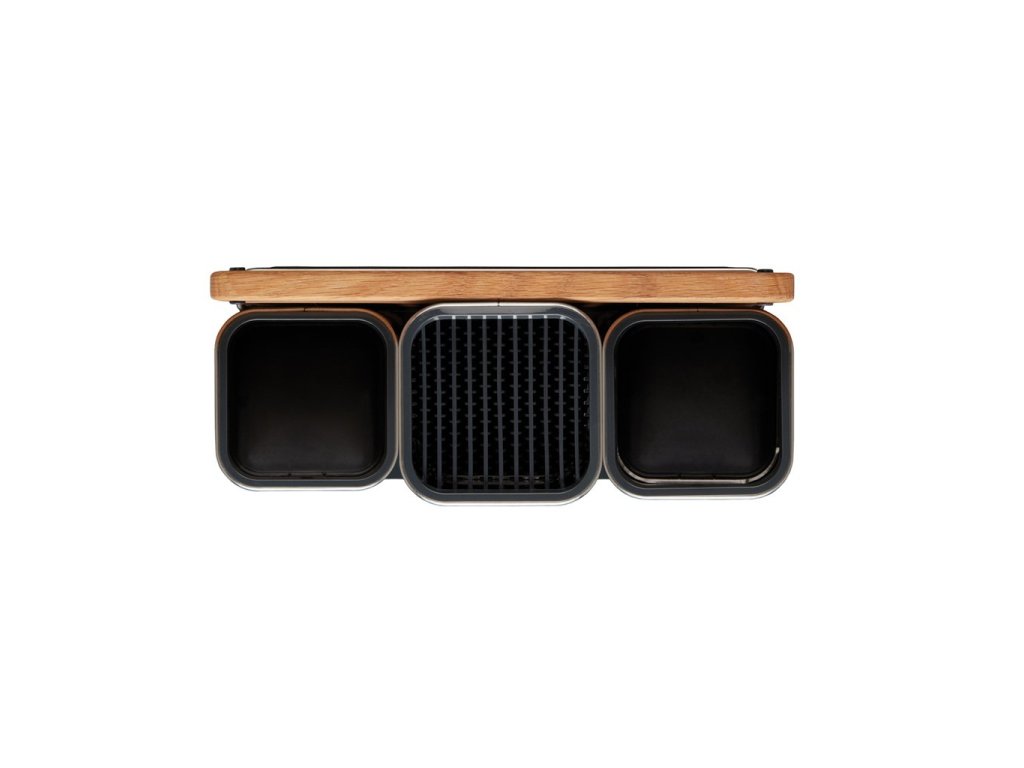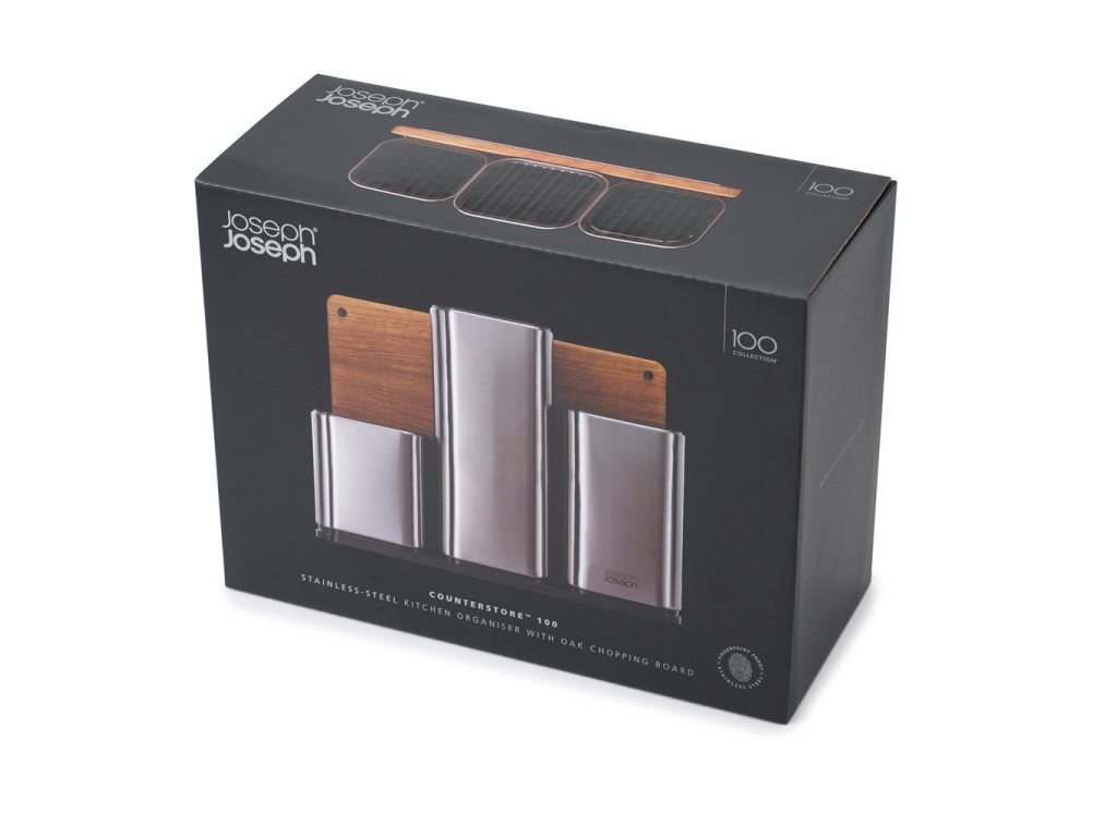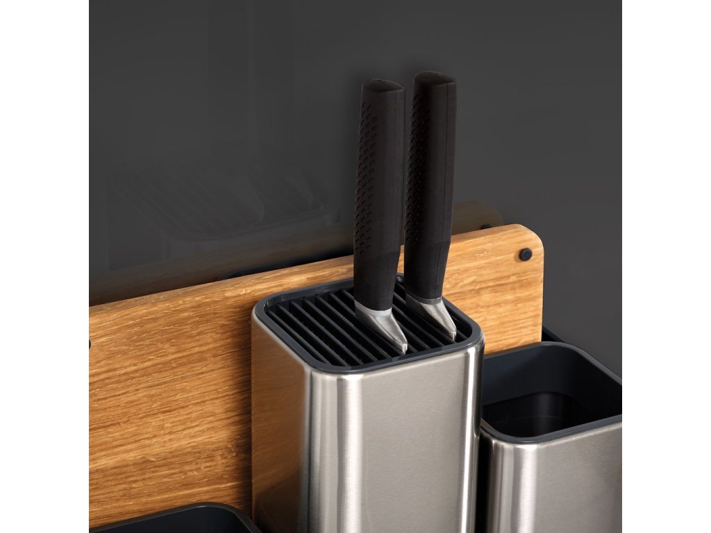 Stainless steel compact organiser JOSEPH JOSEPH CounterStore 100 for the kitchen worktop. Provides space to store knives and small and large kitchen tools. It comes with a wooden cutting board placed in a holder at the back of the stand. The knives slide into plastic slots that keep their blades separate and secure without the risk of scratching. The maximum length of the knife blade is 20 cm.