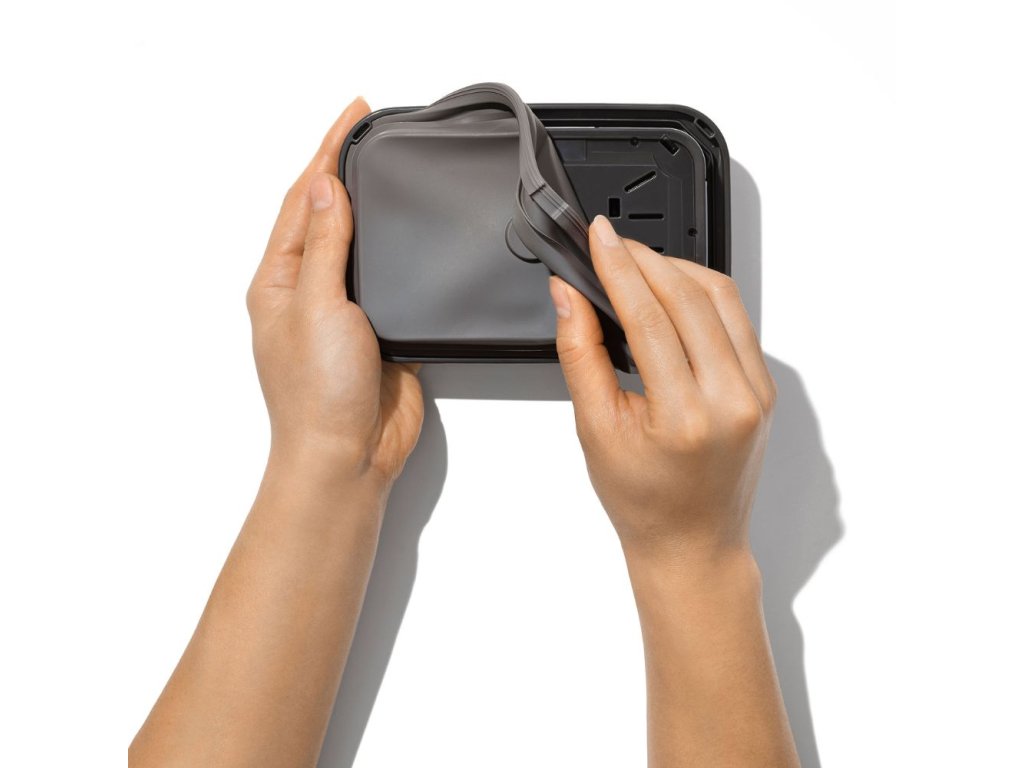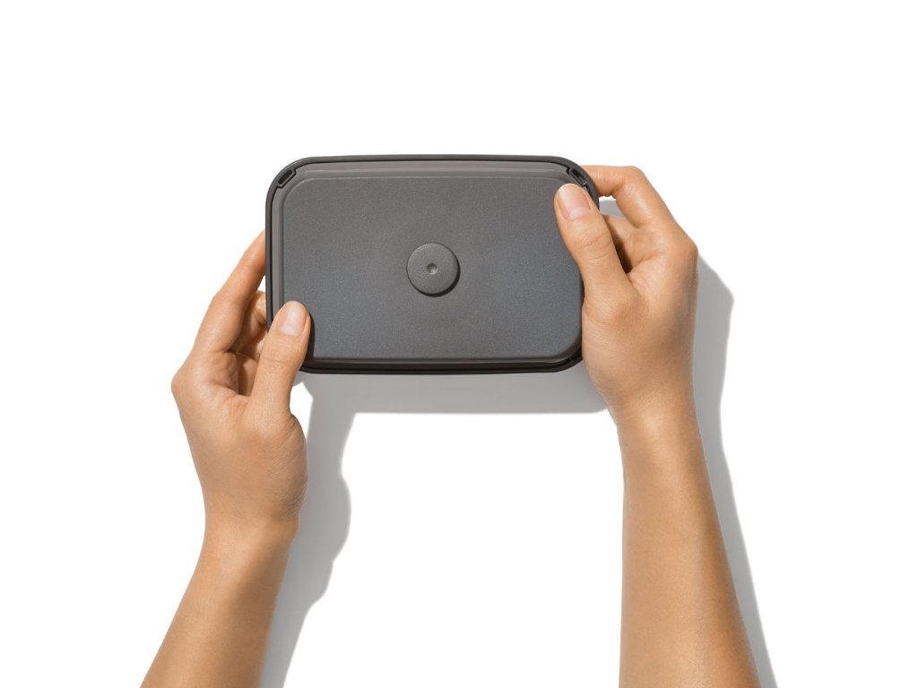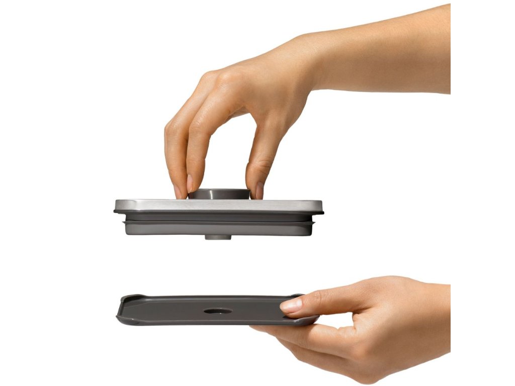 - optional OXO accessories, e.g. measuring cup, can be placed on the underside of the stainless steel lid