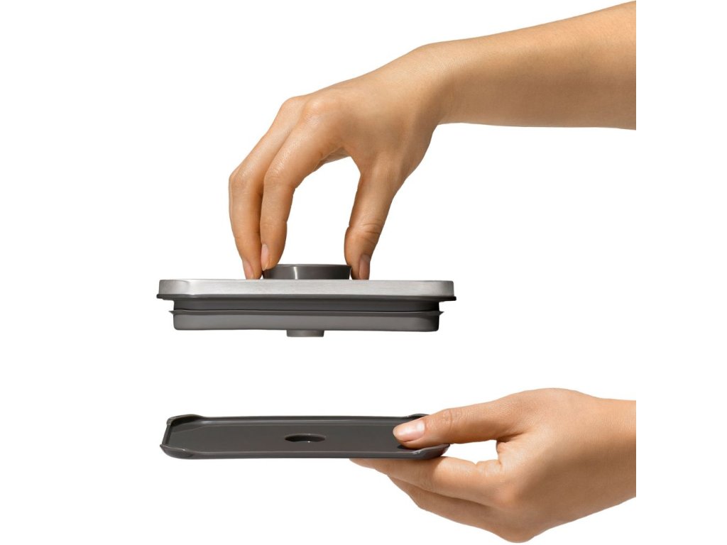 - optional OXO accessories, e.g. measuring cup, can be placed on the underside of the stainless steel lid