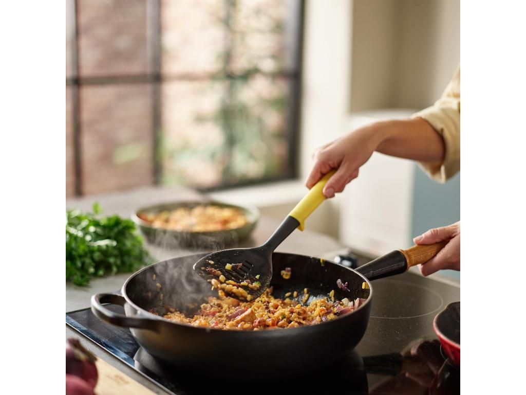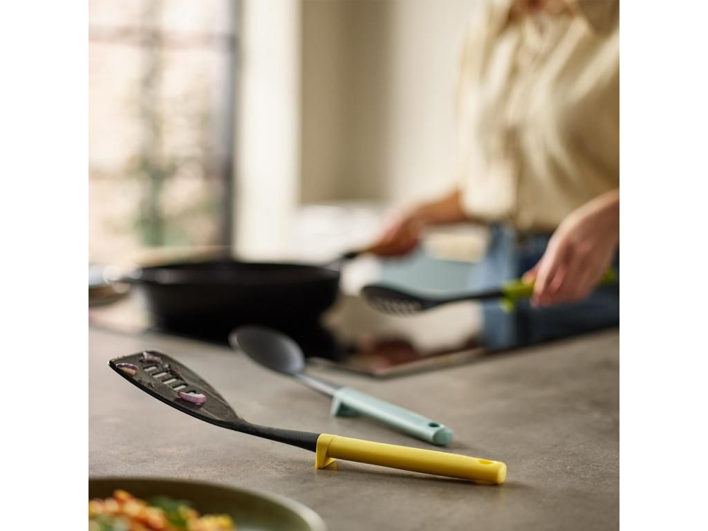 - The perforated kitchen turner Joseph Joseph DUO in yellow is a practical helper for everyday cooking, frying, and convenient serving of finished dishes directly from the pan.