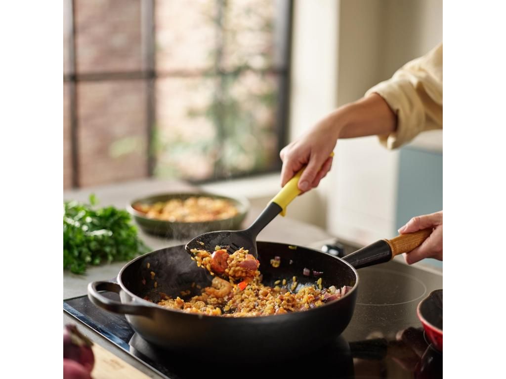 - The combination of a modern black body and a vibrant yellow handle adds a fresh look to the kitchen and easily livens up everyday cooking.