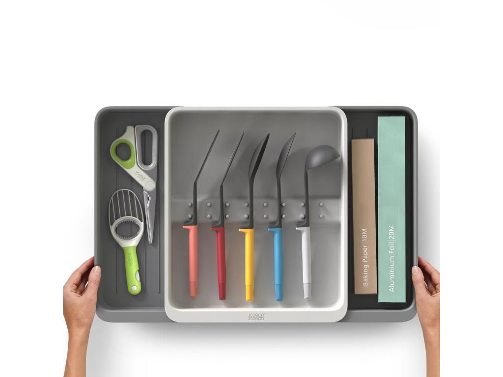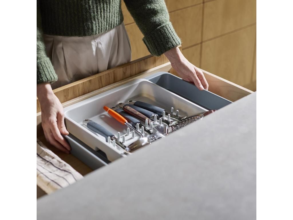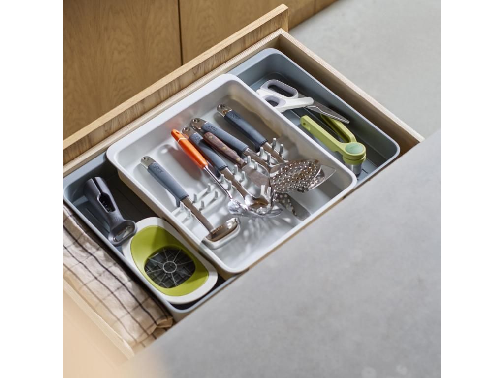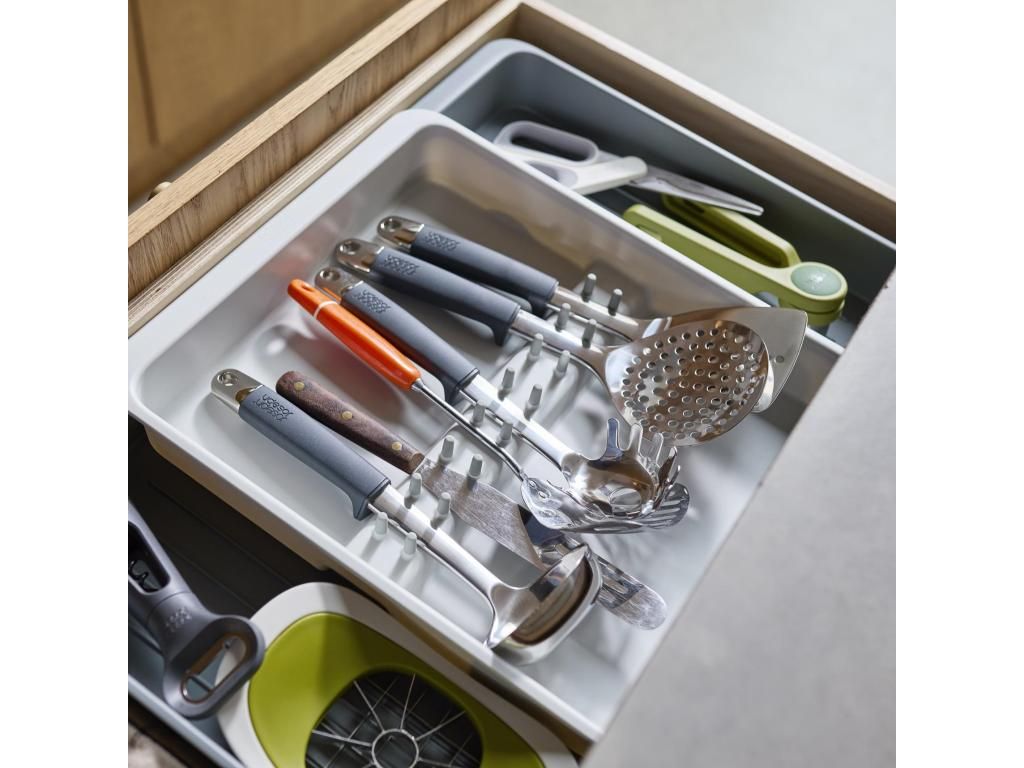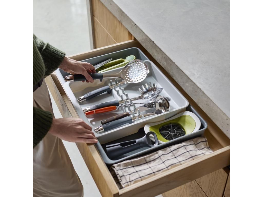 - The Joseph Joseph DRAWERSTORE drawer organiser helps to neatly arrange kitchen utensils and accessories in the drawer.