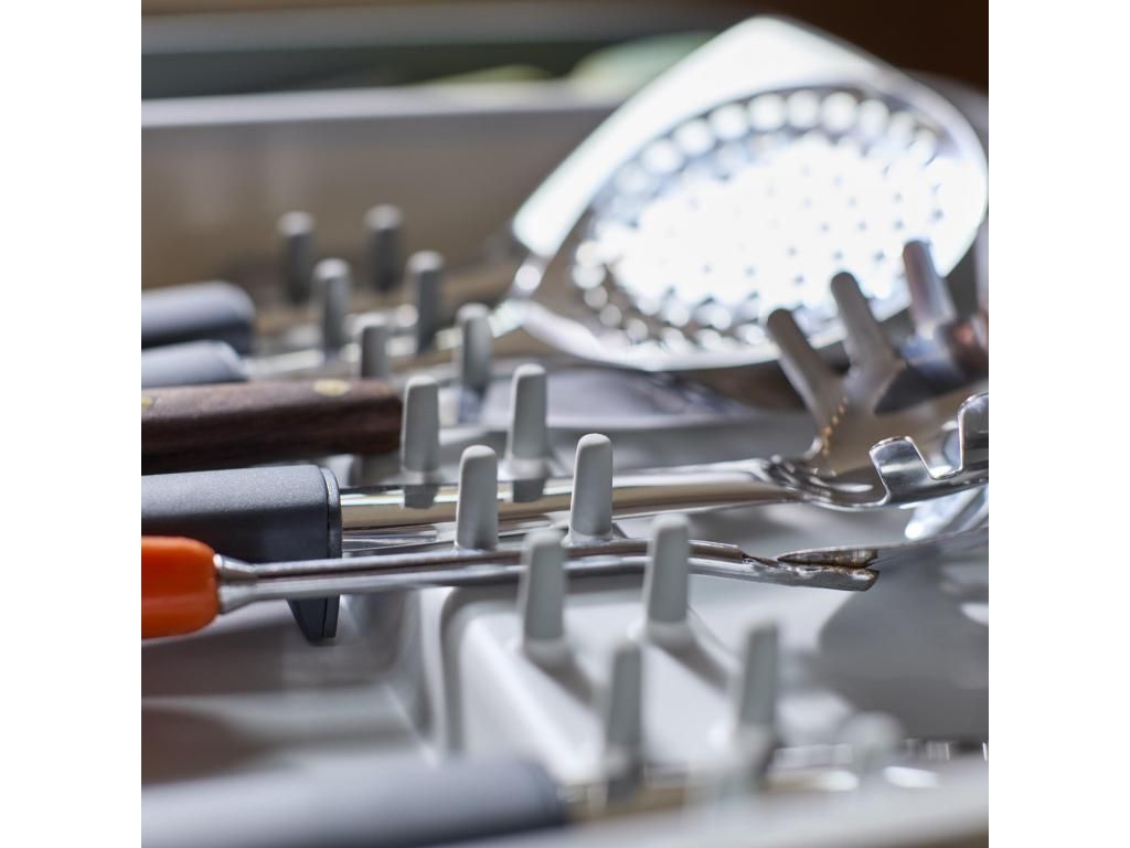 - This practical solution helps keep kitchen utensils neatly organised and always easily accessible when cooking.