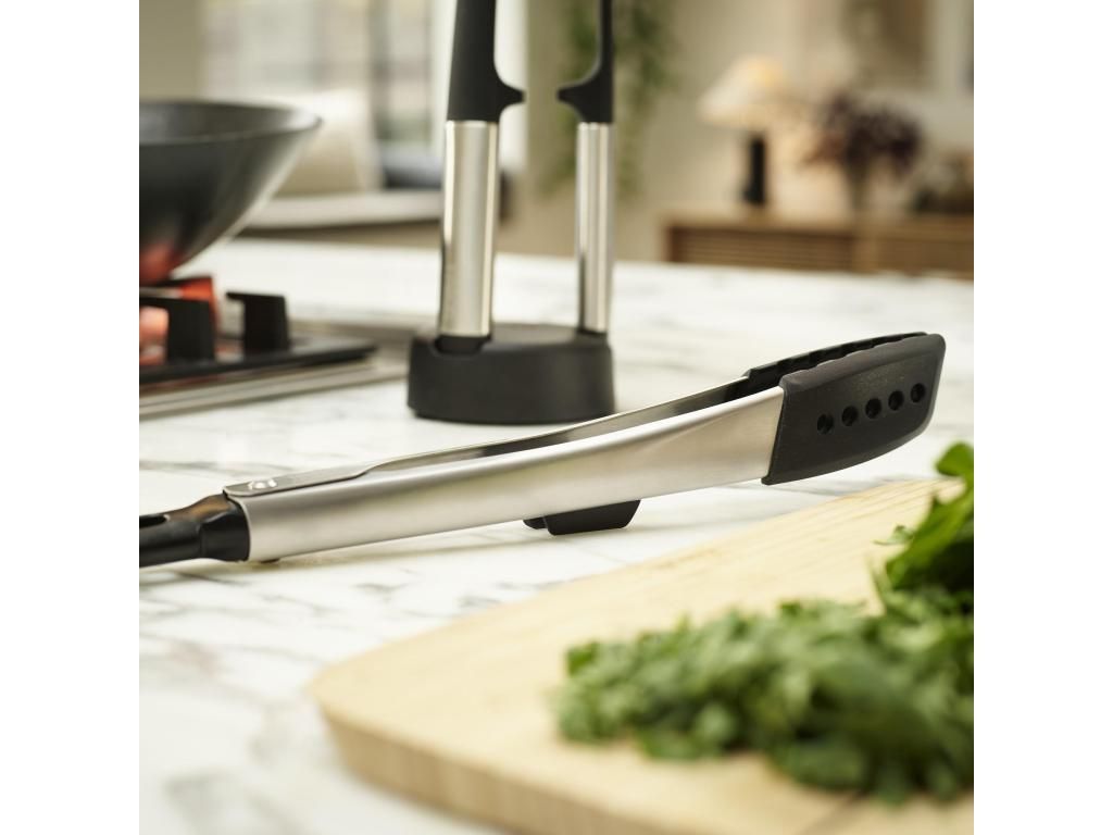 - Integrated rests and balanced handles prevent the working parts of the utensils from touching the work surface when set down.
