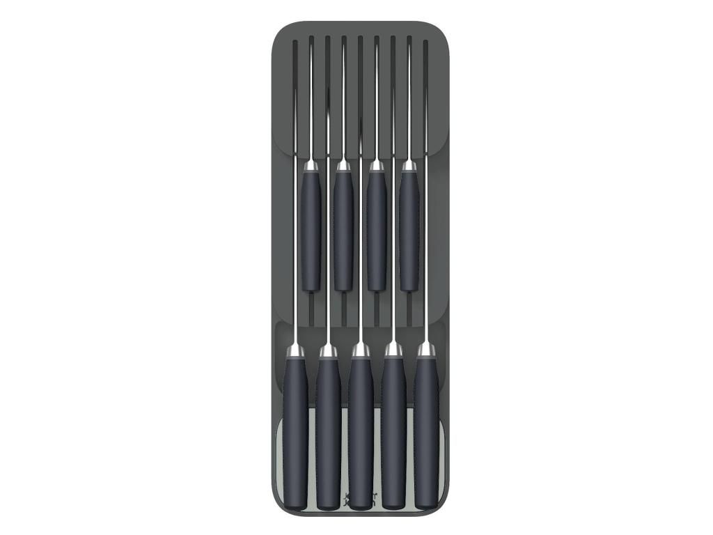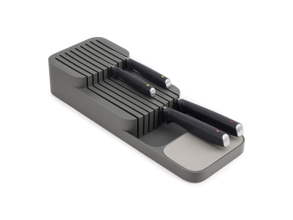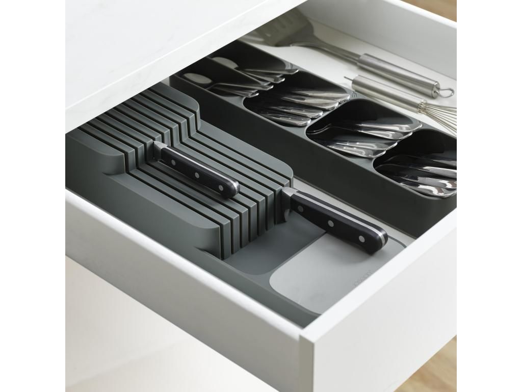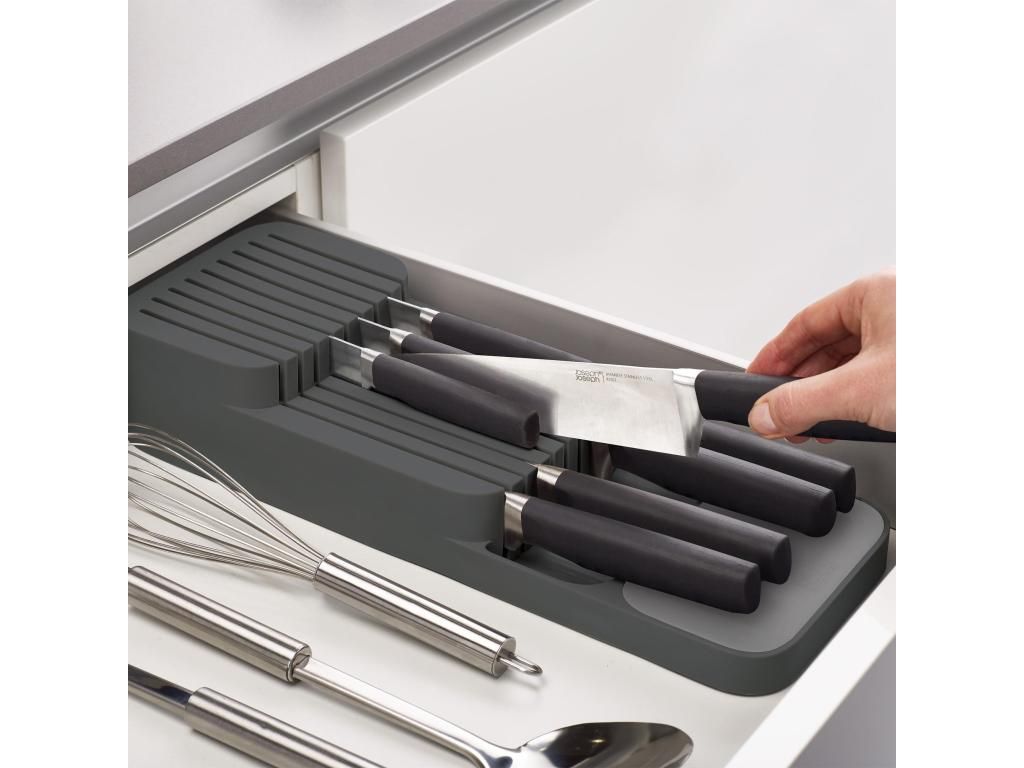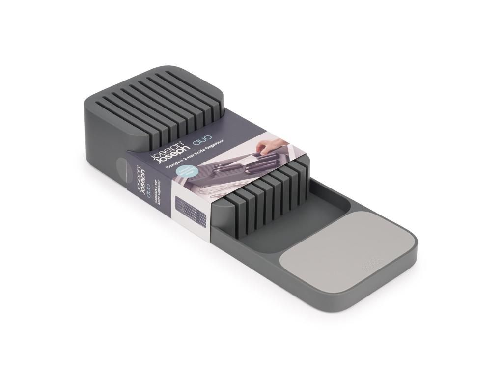 - The Joseph Joseph DUO in-drawer knife organizer is a practical solution for safely and neatly storing kitchen knives directly in the drawer, without unnecessarily taking up counter space.