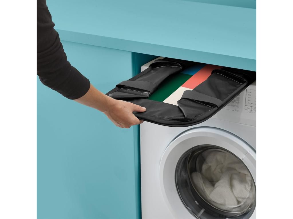 - Thanks to its flat-fold design, you can easily slide it into a narrow space next to the washing machine or store it in a cupboard when not in use.