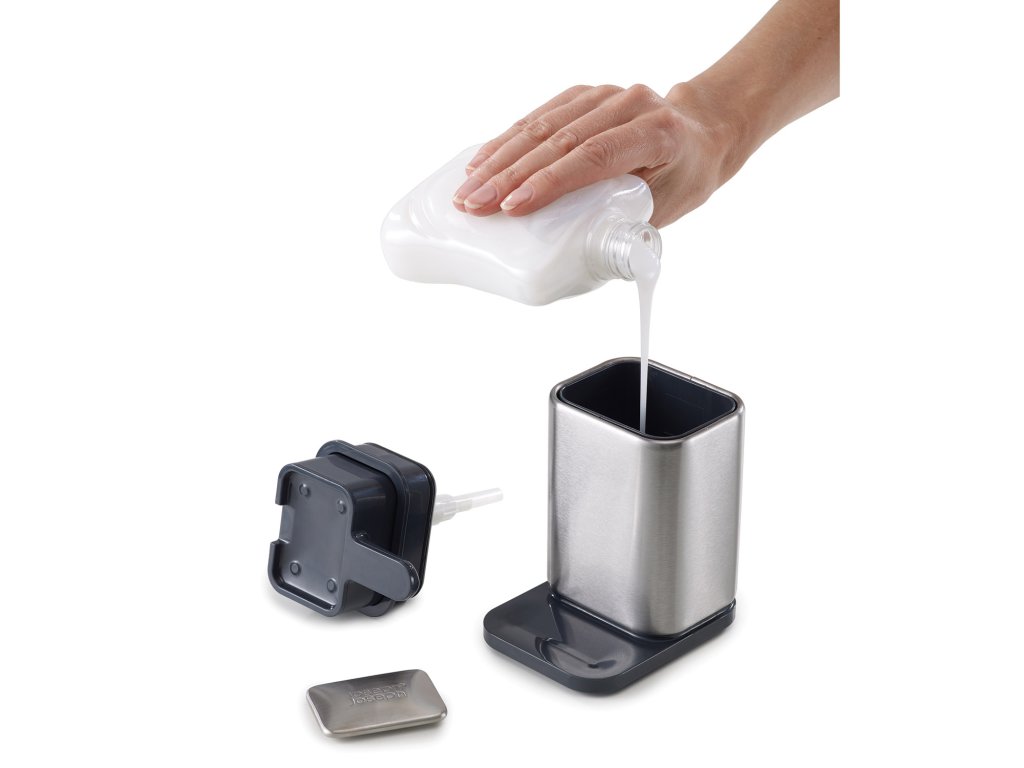 Stainless steel soap is commonly used to remove odors from hands. If you work with aromatic ingredients such as garlic, onions or fish, it is difficult to achieve fragrant hands with ordinary soap. Stainless steel soaps, on the other hand, remove the smell and do not wash your hands. That's why the designers of the liquid soap dispenser placed a stainless steel soap in the top of the pump, which does not interfere with the clean design of the container. Perfectly clean hands after and during cooking are a sign of a professional and responsible approach.