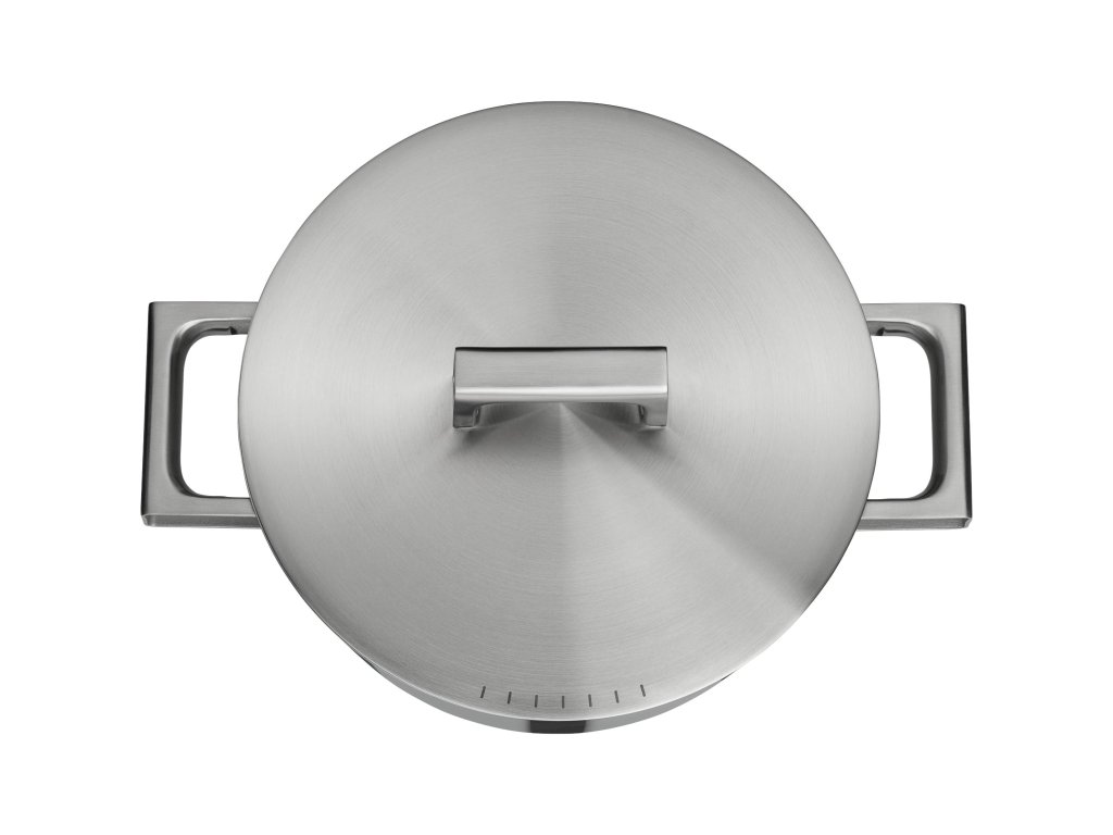 - The double-walled stainless steel pot lid is equipped with a hidden steam vent, which is suitable for use with side-mounted extractor hoods.