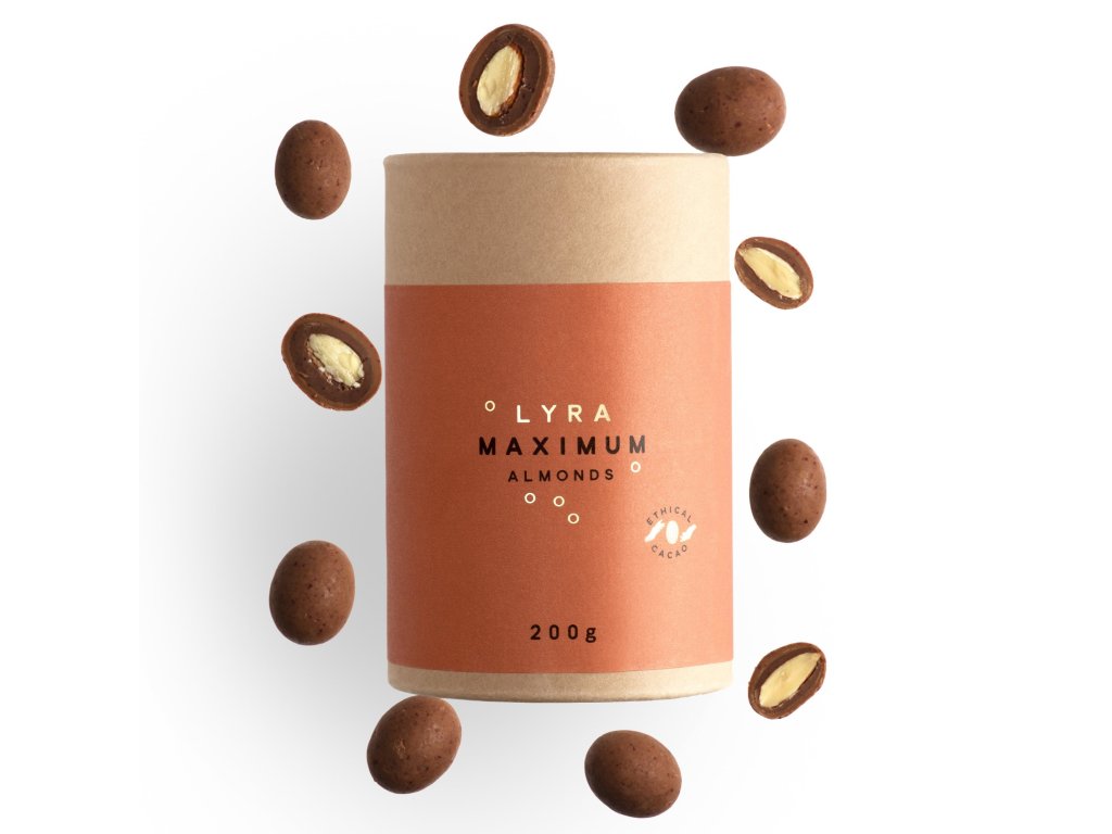Almonds in nougat and caramel chocolate MAXIMUM 200 g, LYRA