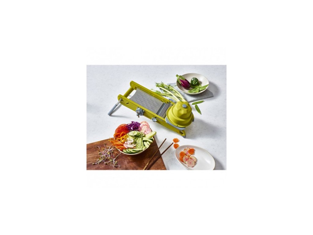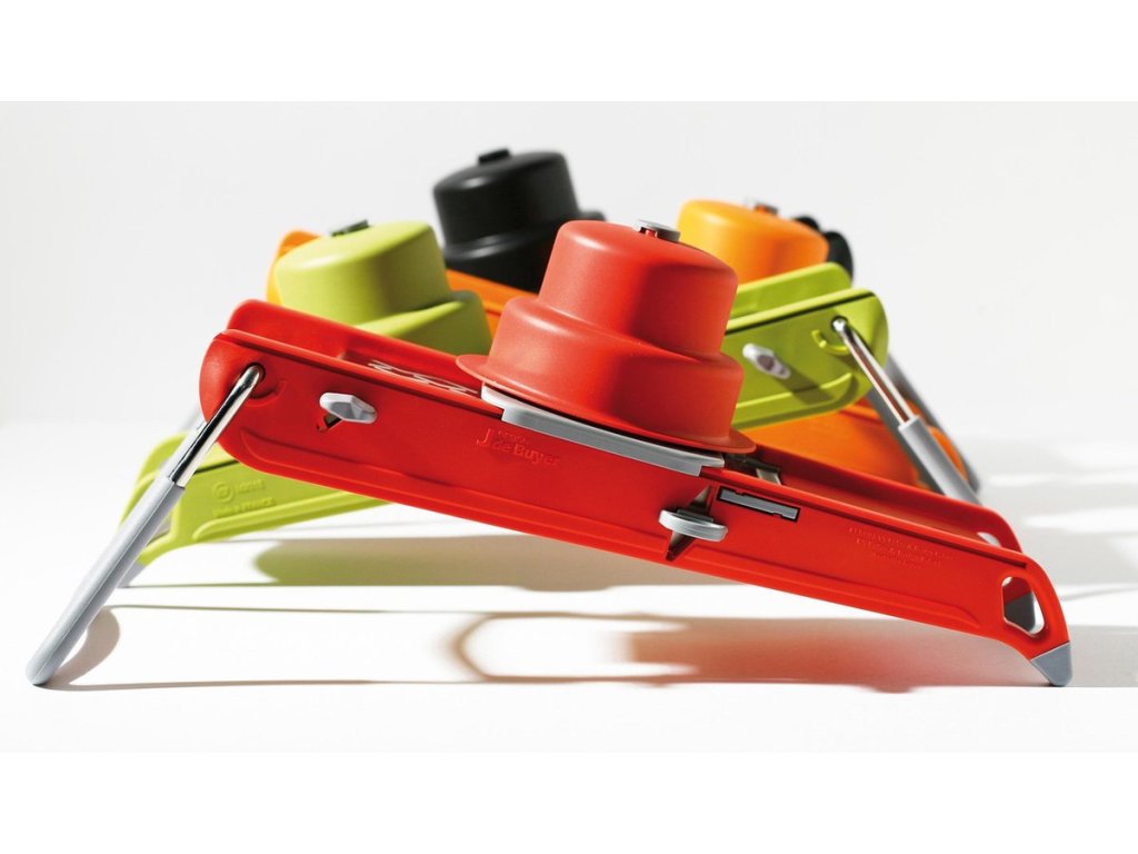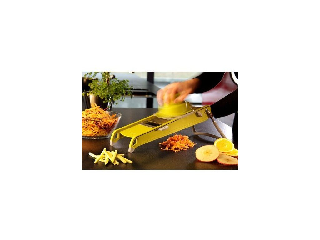 The SWING PLUS mandolin from the French company de Buyer is a multifunctional household helper that saves work, time and storage space. The non-slip feet for comfortable support of the mandoline on the work surface ensure stability while the wide cutting surface makes it easy to process even larger pieces of food. An essential part of the mandoline is the ergonomic fruit/vegetable holder which allows you to peel very quickly and safely. With its help, you can easily create grated slices with just a twist.