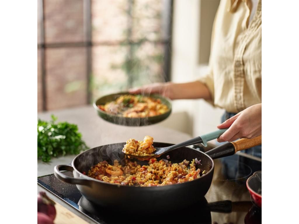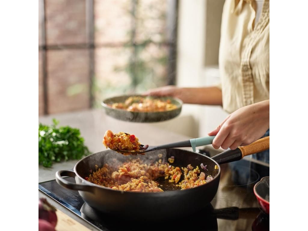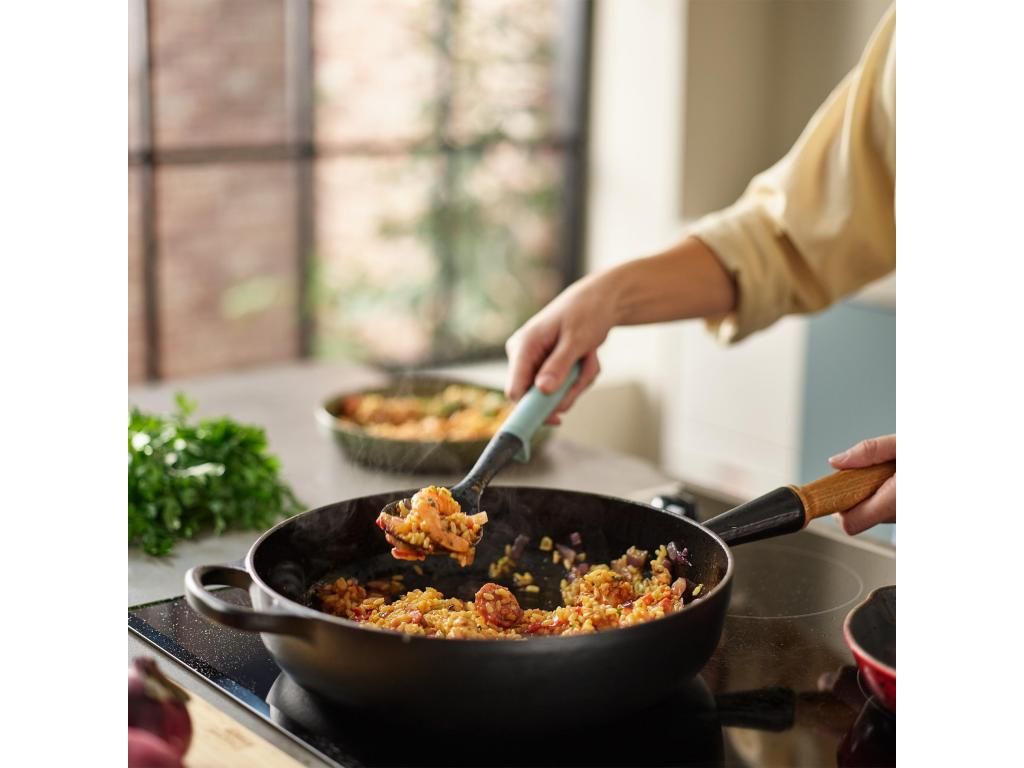 - The lightweight construction facilitates handling when scooping, flipping, and serving food directly from the pan to the plate.