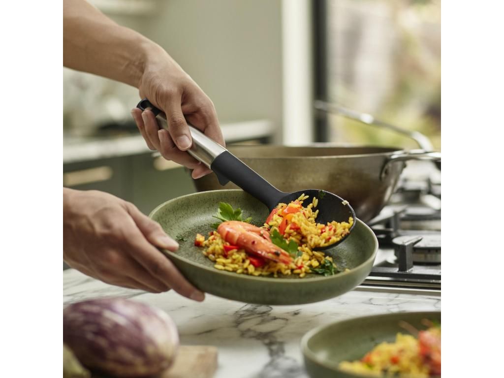 - The ergonomically shaped handle provides a comfortable grip and good control when stirring or serving food.
