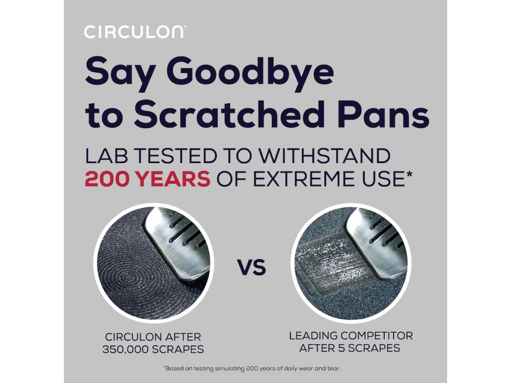 - Part of the Circulon SCRATCHDEFENSE C1 collection, it comes with a lifetime warranty that covers any damage caused by scratches, peeling or chipping of the surface