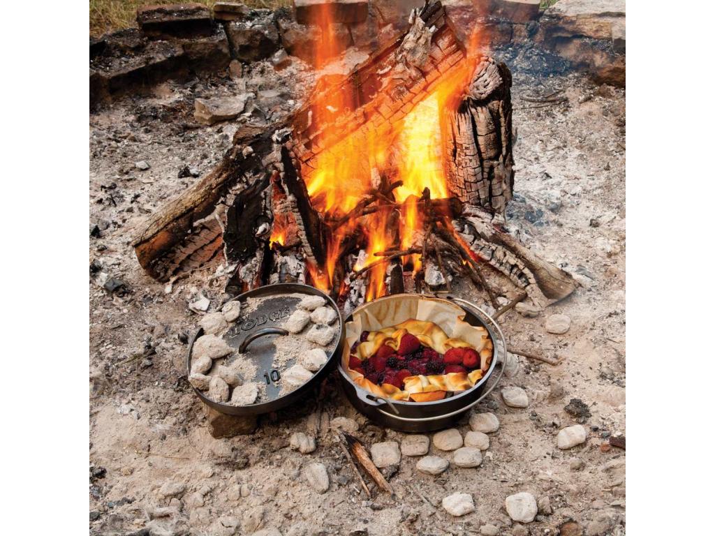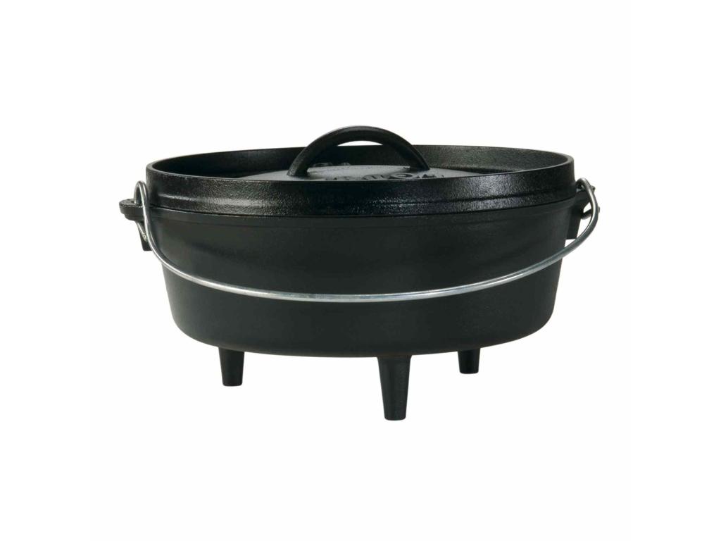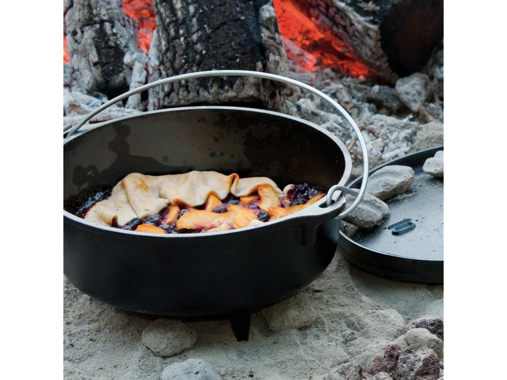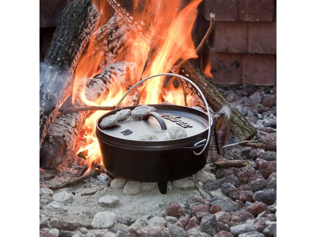 - The cast iron outdoor cooking pot from the brand Lodge with a capacity of 3.8 l is an ideal companion for cooking outdoors, whether over a fire, hot coals or suspended above a flame.