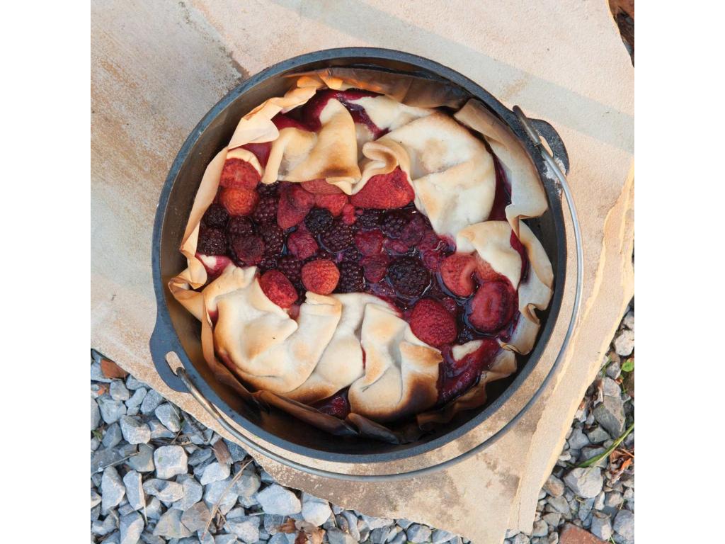 - The flat profile lid with a raised rim allows the hot coals to be positioned from above, creating an even baking environment as in an oven.